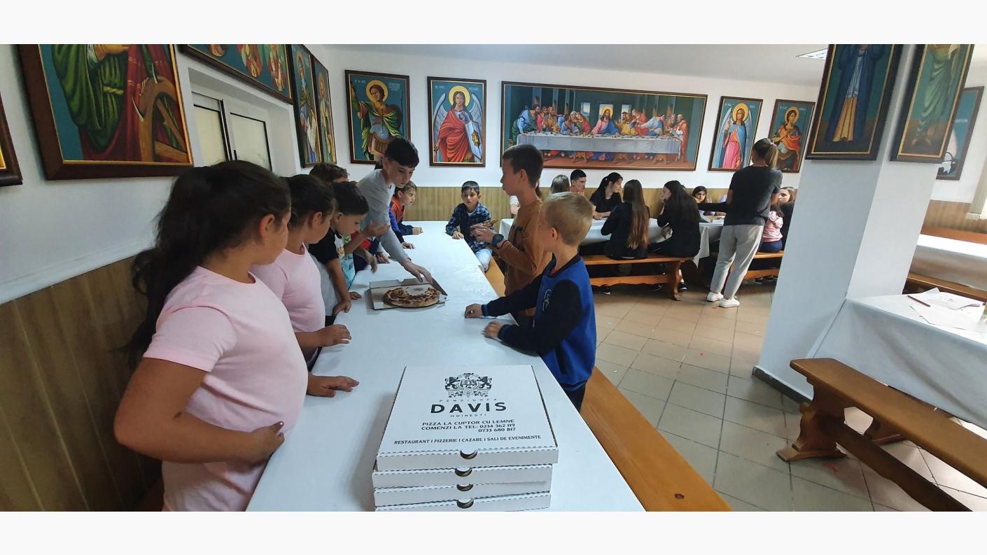 În pauza dintre activități, ca și în prima zi copiii au servit sucuri, dulciuri și pizza oferite de către organizatori și cu suportul Pensiunei Davis din Moinești.