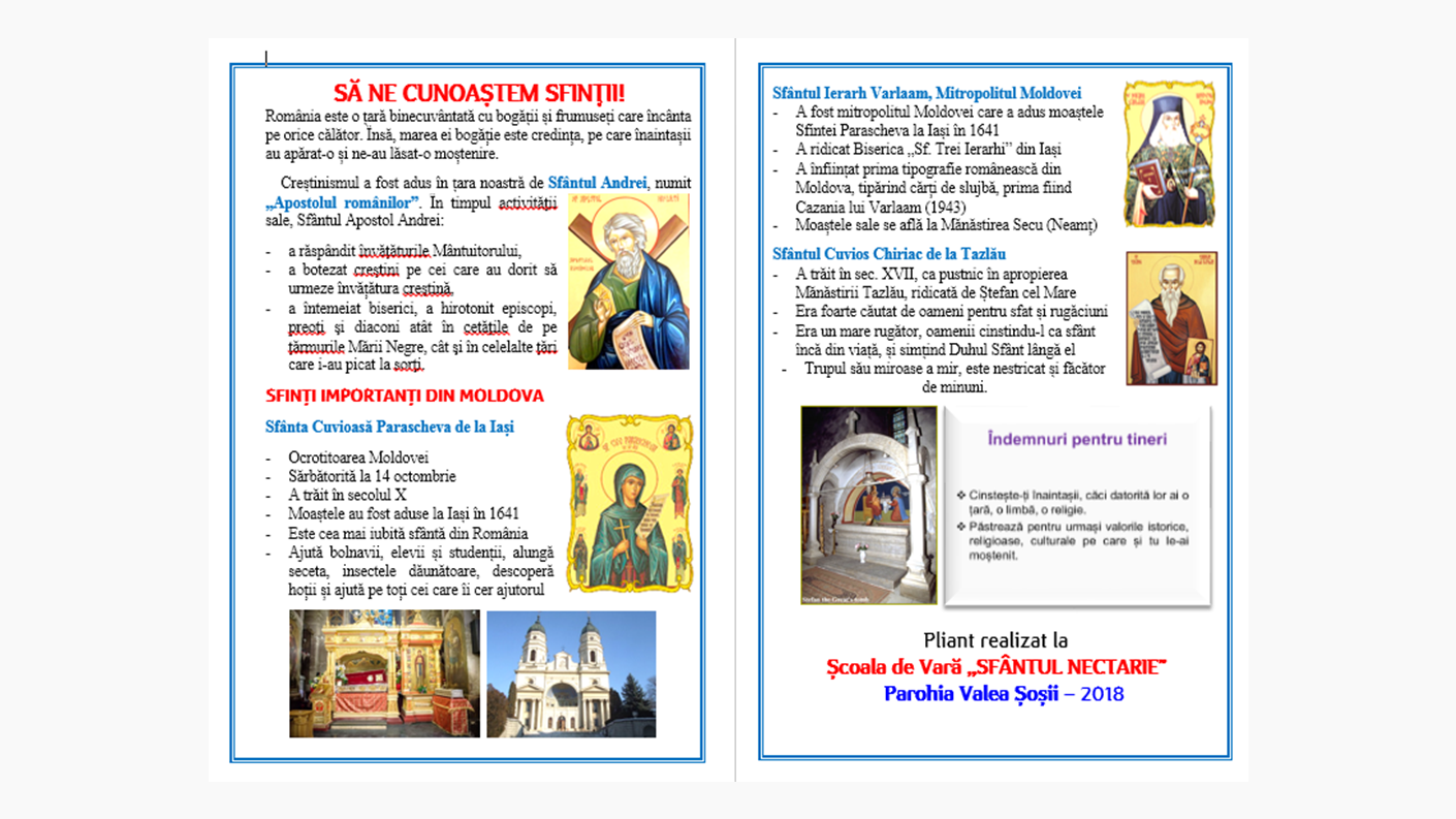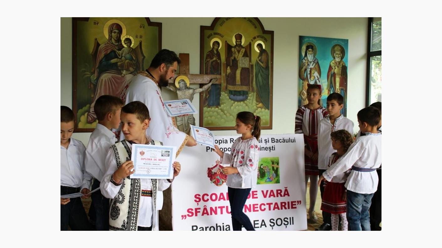Cu binecuvântarea Înaltpreasfințitului Ioachim, Arhiepiscopul Romanului și Bacăului, în parohia Valea Șoșii s-a desfășurat în săptămâna 2-8 iulie 2018, Școala de Vară „Sfântul Nectarie”. Aceasta face parte din proiectul Protopopiatului Moinești, „Școala de Vară – Hristos, bucuria copiilor”. Cei 30 de copii între 5 și 16 ani, împărțiți în două grupe, Îngerașii și Mărturisitorii, au participat la activități cu caracter artistic, de formare personală și recreative. S-au realizat și activități catehetice în cadrul Proiectului eparhial „Cateheze în parohii”.