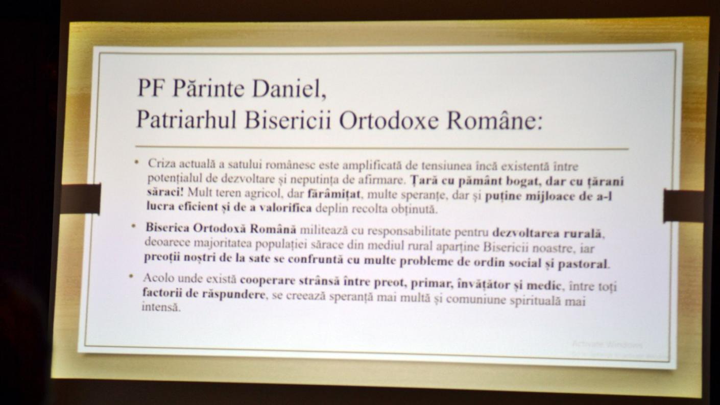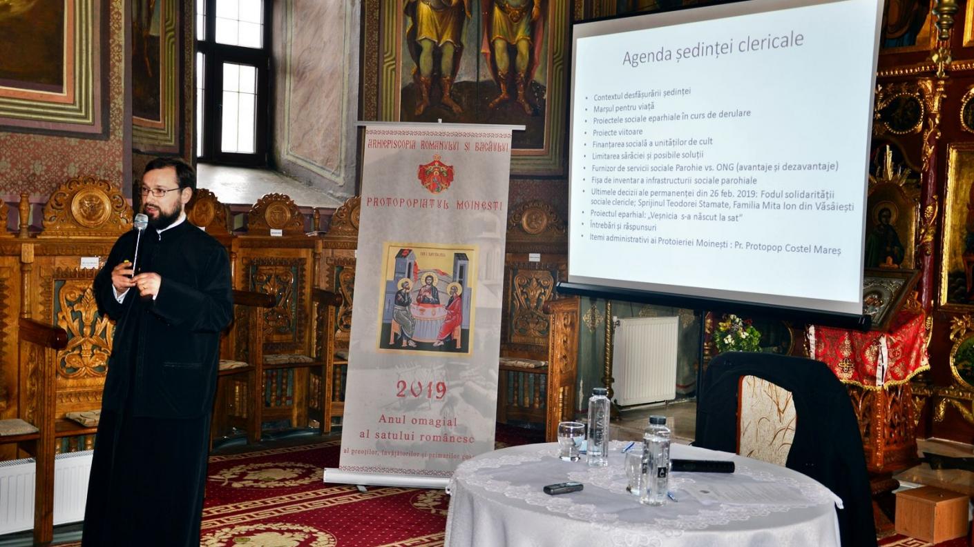 În prima parte a întrunirii a vut loc susținerea referatului cu tema „Criza actuală a satului românesc și implicarea BOR în atenuarea acesteia”, susținut de părintele Codrin Laslău, de la Parohia Cernu, una dintre temele propuse de Sfântul Sinod al Bisericii Ortodoxe Române pentru anul 2019 - Anul omagial al satului românesc (al preoților, învățătorilor și primarilor gospodari) și Anul comemorativ al Patriarhilor Nicodim Munteanu și Iustin Moisescu și al traducătorilor de cărți bisericești.