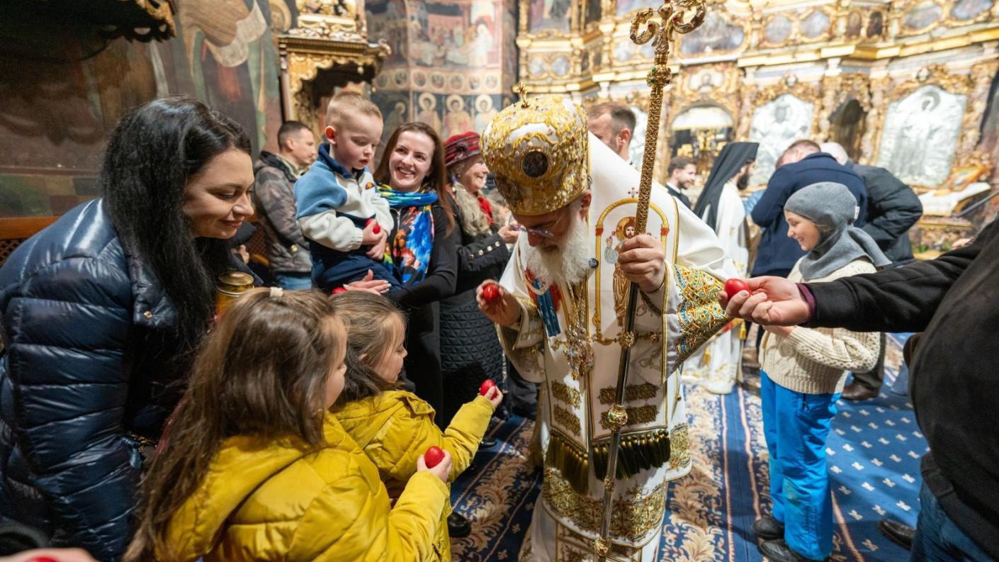 La final, toți credincioșii prezenți la Dumnezeiasca Liturghie au primit ouă roşii, pască şi cozonac, salutând ierarhul cu urarea pascală „Hristos a înviat!”.