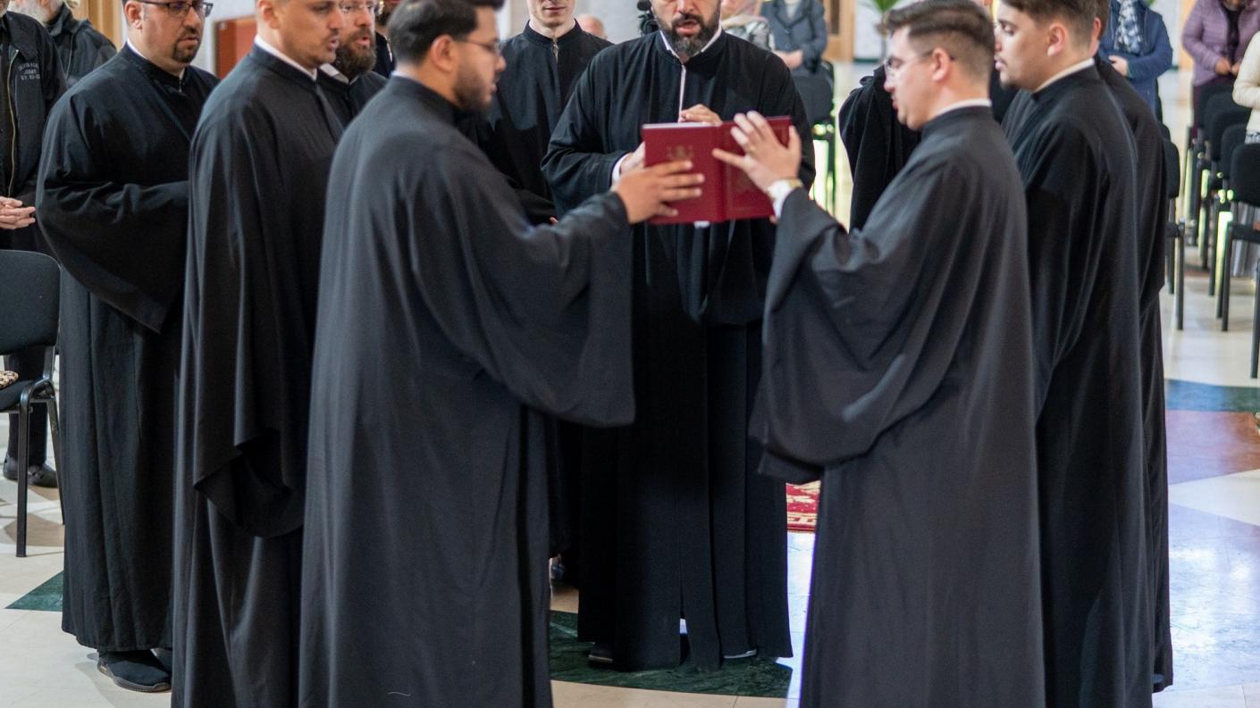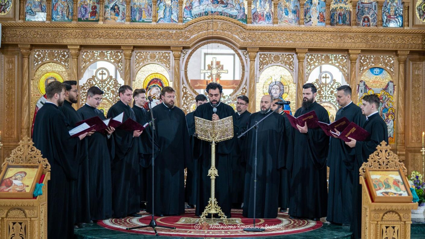 În duhul melosului bizantin, domnul Adrian Sîrbu, Lect. Univ. Dr. în cadrul Universității Naționale de Arte „George Enescu” din Iași, secția Muzica Religioasă, împreună cu membrii corului Byzantion, a oferit celor prezenți clipe de interiorizare și meditație duhovnicească, prin care cei chemați la rugăciune să poată coborî în adâncul ființei și să descopere pe „omul cel tainic al inimii”.
