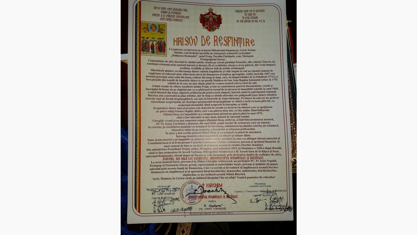 La sfârșitul Sfintei Liturghii, Înaltpreasfințitul Ioachim a hirotesit în treapta de iconom pe Părintele paroh Ionuț Corobană și a oferit distincții de vrednicie credincioșilor care s-au evidențiat prin efortul pe care l-au depus la împlinirea lucrărilor de refacerea a lăcașului sfânt.
