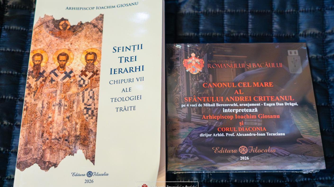Cu acest prilej, părintele Marius Popescu, de la Parohia „Sfântul Ioan” din Bacău, cadru didactic universitar la Facultatea de Filosofie a Universității „Alexandru Ioan Cuza” din Iași, a prezentat volumul „Sfinții Trei Ierarhi – chipuri vii ale teologiei trăite”, semnat de Arhiepiscopul Ioachim Giosanu, precum și un suport digital care cuprinde înregistrarea Canonului cel Mare al Sfântului Andrei Criteanul, în interpretarea Înaltpreasfințitului Părinte Arhiepiscop Ioachim și a Corului „Diaconia” al Catedralei Arhiepiscopale din Roman. „A fost o mare bucurie pentru cei prezenți să afle că au la îndemână informații atât de frumos așezate în scris și că pot participa cu mai multă deschidere la slujba Canonului cel Mare”, a arătat acesta, menționând că volumul și înregistrarea pot fi achiziționate din magazinele de colportaj ale Arhiepiscopiei Romanului și Bacăului.