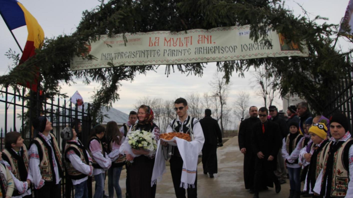 Începând cu ora 11.00, la bucuria parohiei nemțene s-a alăturat Părintele Arhiepiscop Ioachim, care prin prezența Sa a binecuvântat inimile credincioșilor și ale copiilor, care l-au întâmpint cu pâine și sare, semnele ospitalității și a generozității creștine.