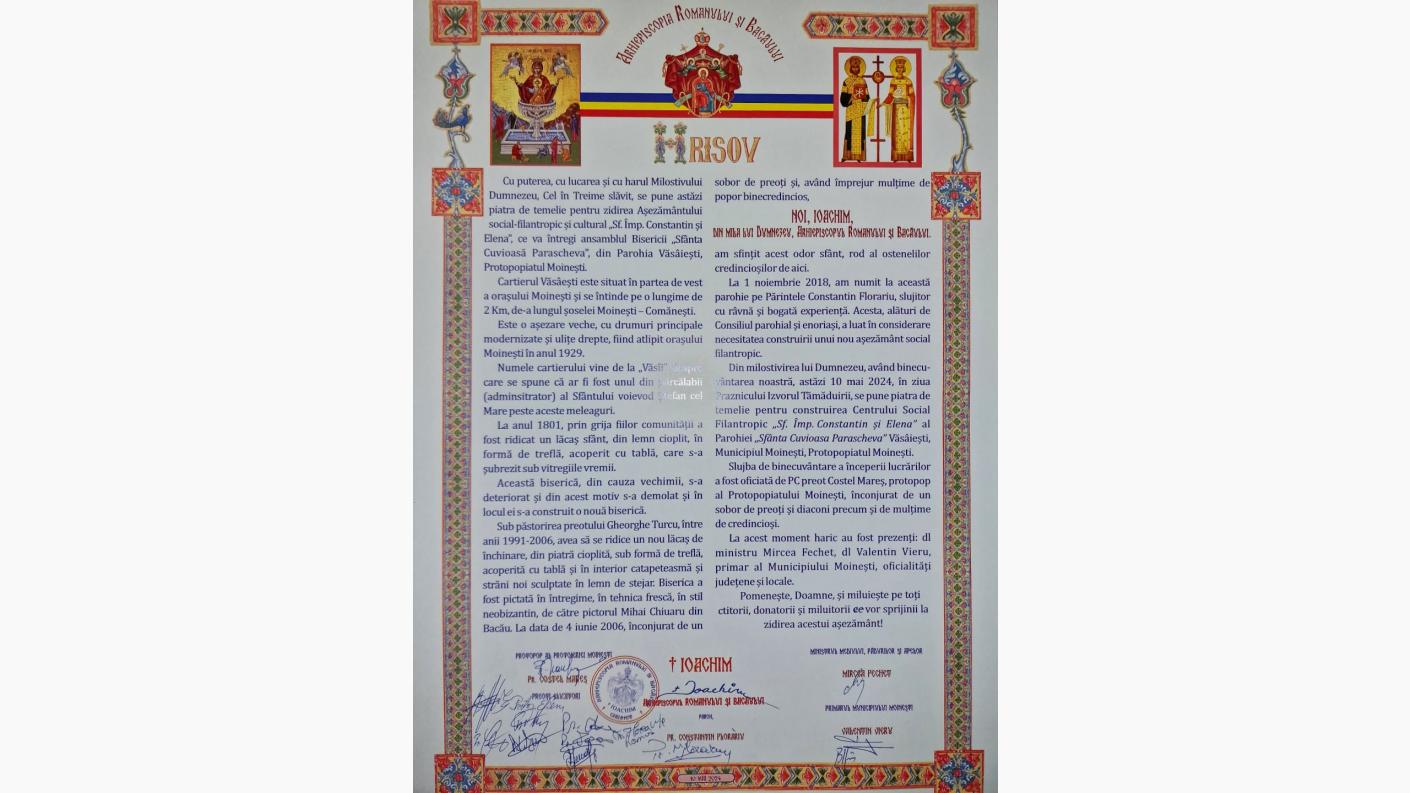 Vineri, 10 mai 2024, în ziua Praznicului „Izvorul Tămăduirii”, a fost așezată și binecuvântată piatra de temelie a Centrului Social Filantropic „Sfinții Împărați Constantin și Elena” al Parohiei „Sfânta Cuvioasă Parascheva” Văsiești, Municipiul Moinești, Protopopiatul Moinești.