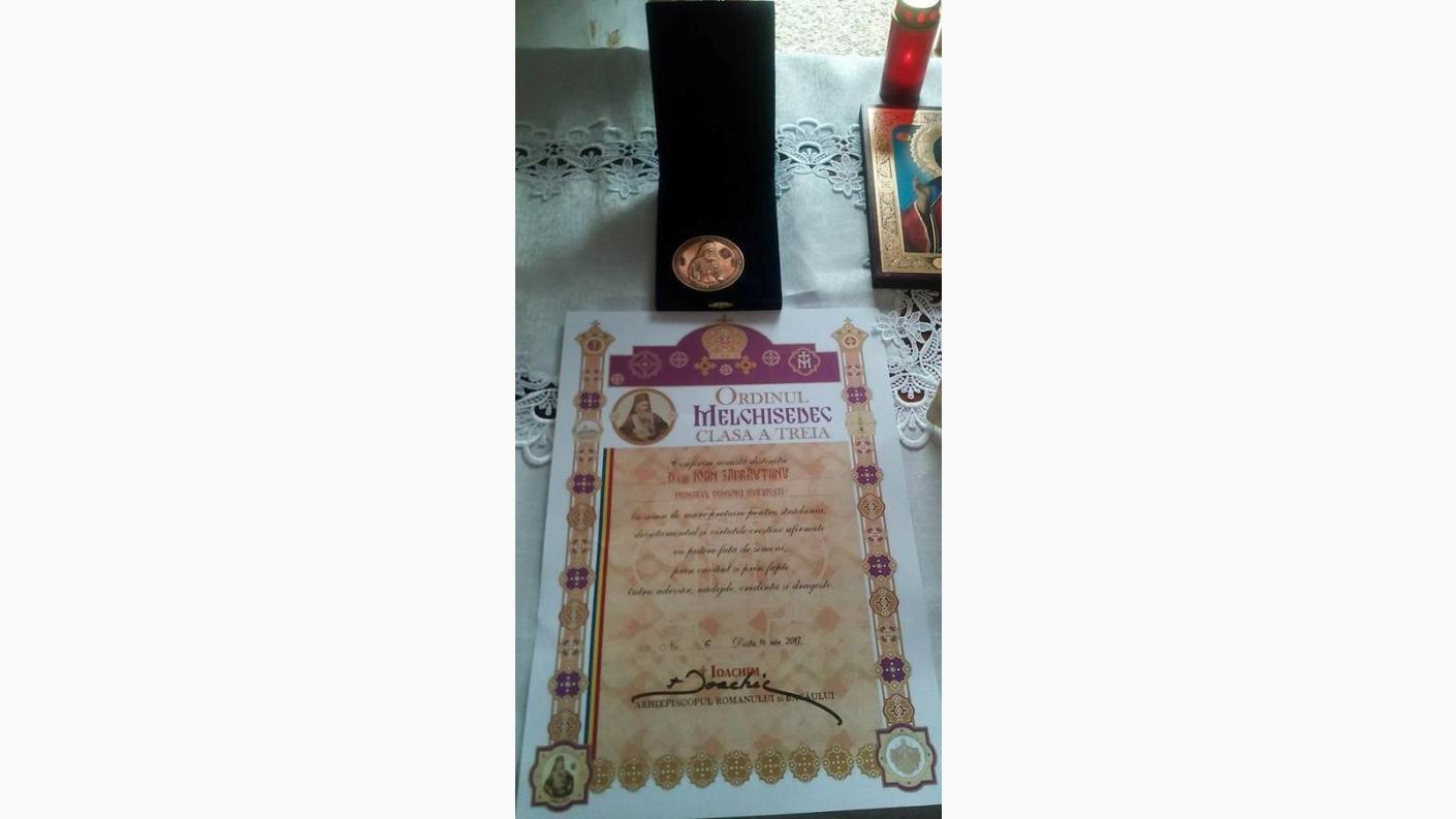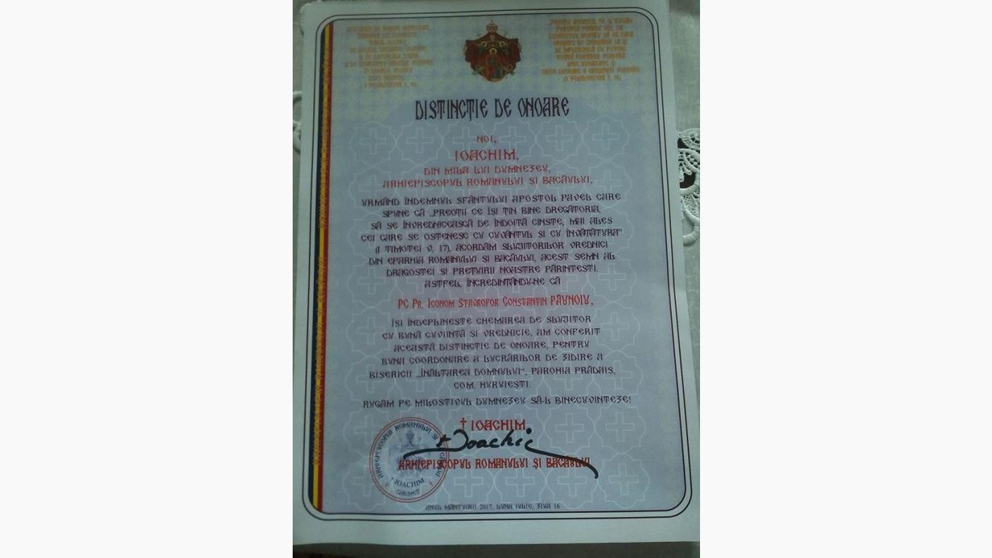 Pentru osteneala depusă în buna administrare a patrimoniului bisericesc, IPS Ioachim a înmânat PC Pr Ic.Stavr. Constantin Păunoiu, „DIPLOMA DE ONOAREˮ, iar domnului primar Ioan Zăbrăuțanu, „ORDINUL MELCHISEDECˮ pentru mireni, clasa a-III-a.