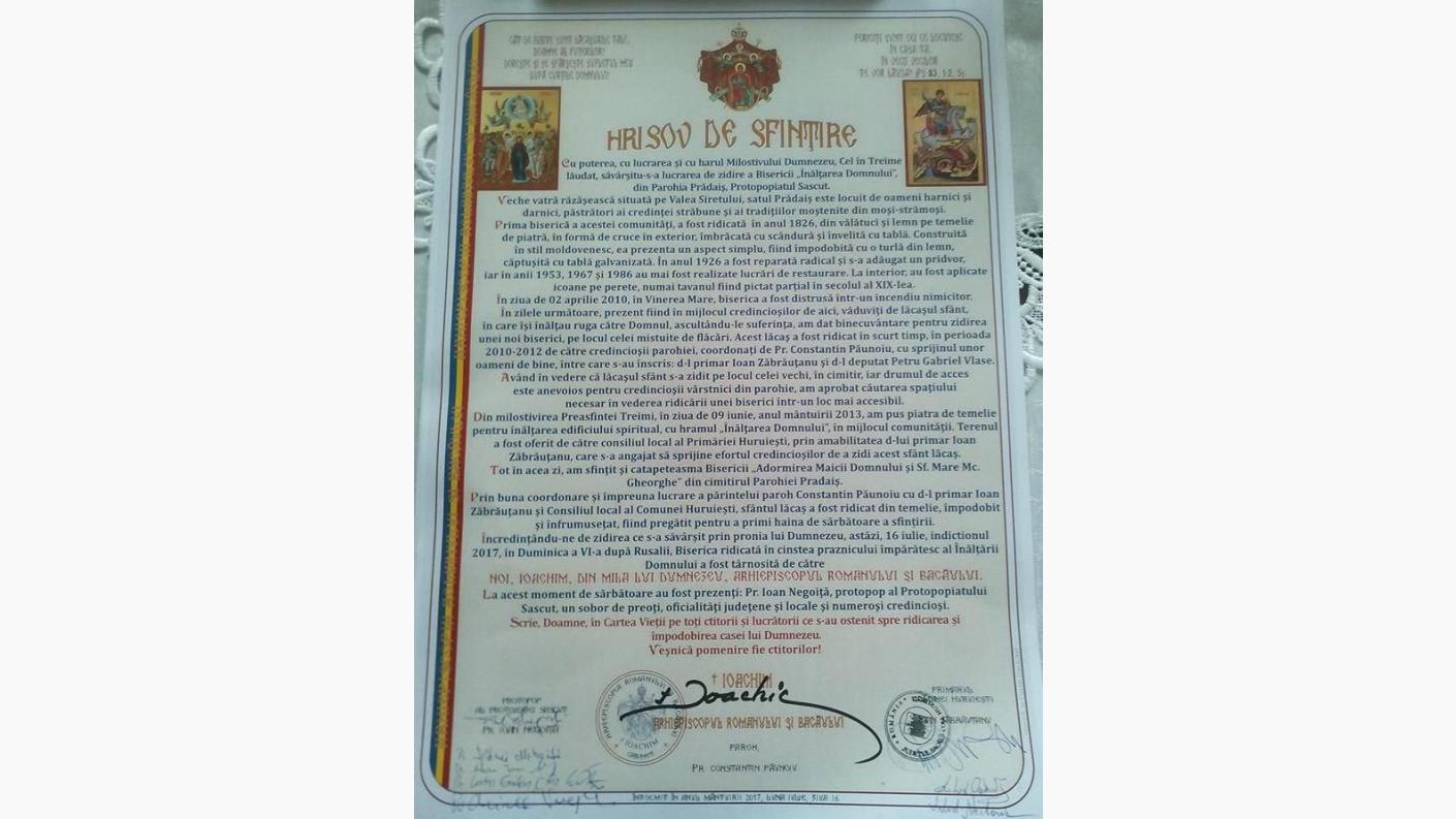 Astăzi, 16 iulie 2017, pentru credincioșii Parohiei Pradaiș, comuna Huruiești, Protoieria Sascut a fost prilej de aleasă sărbătoare pricinuită de târnosirea noii biserici cu hramul „Înălțarea Domnuluiˮ de către IPS Ioachim, arhiepiscopul Romanului și Bacăului.