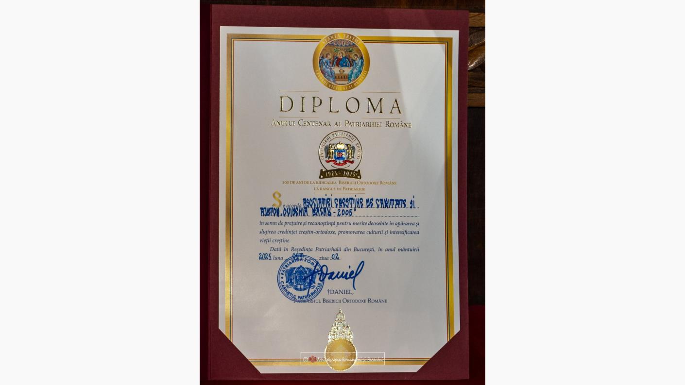 Distincția – Diploma Anului Centenar al Patriarhiei Române – a fost oferită părintelui paroh de către Preasfințitul Părinte Teofil Trotușanul, din încredințarea Preafericitului Părinte Daniel, Patriarhul Bisericii Ortodoxe Române.