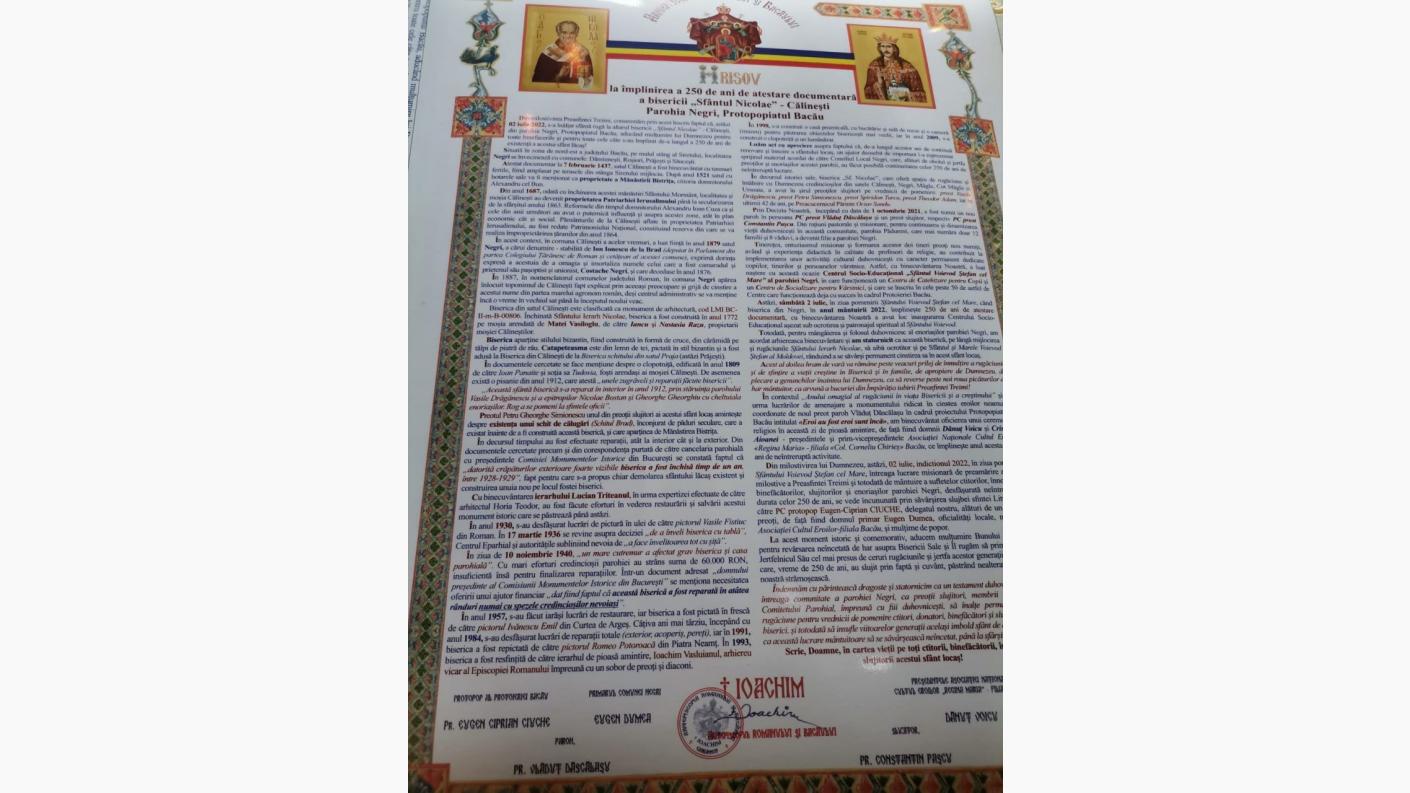 S-a dat citire de către părintele secretar Ciprian Olteanu hrisovului la împlinirea a 250 de ani de atestare documentară a Bisericii din Călinești prin care s-a statornicit ca acesta să aibă ocrotitor și pe Sfântul Ștefan cel Mare. Acesta a fost semnat apoi de către preoții prezenți, de către domnul primar al comunei Negri, Eugen Dumea și de către membrii Asociației Cultul Eroilor – Filiala Bacău.