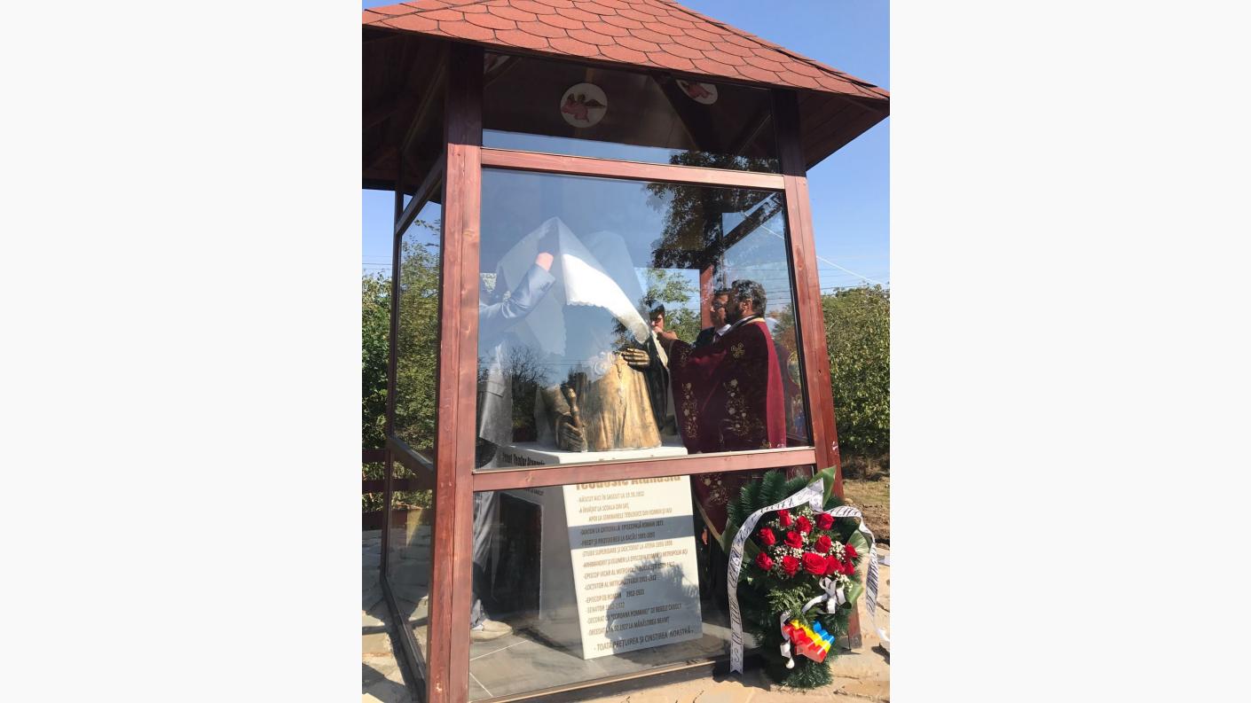 Acest monument, care cuprinde bustul Episcopului Teodosie, alături de icoana Mântuitorului și cea a Acoperământului Maicii Domnului, precum și un mozaic reprezentativ al Catedralei Episcopale de la Roman, s-a ridicat prin grija și sprijinul financiar al familiei Ing. Tănase Gheorghe, unul dintre urmașii Ep. Teodosie și este așezat în localitatea Sascut-Sat în imediata apropriere a casei unde s-a născut vrednicul ierarh. În cuvântul său de evocare, domnul Ing. Tănase Gheorghe a vorbit despre familia, copilăria și viața ierarhului Teodosie, precum și despre grija deosebită pe care a avut-o acest ierarh față de familiile celor care s-au jertfit pe câmpurile de luptă, conștientizând că o problemă foarte mare pe lângă viețile pierdute, era cea a copiilor orfani și a femeilor rămase văduve, care rămăseseră fără niciun sprijin. De aceea, ocrotirea orfanilor, cărora le-a oferit fără rezervă burse de studii, era o obligație morală față de jertfa părinților lor, pentru viitorul celor care au supraviețuit într-o țară unită, o responsabilitate civică, deoarece acei fii ai neamului puteau reprezenta partea bună a generației viitoare.