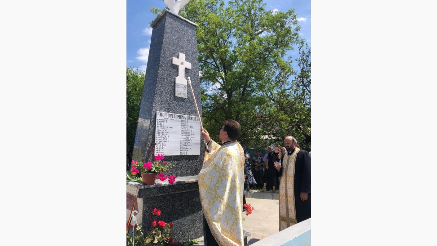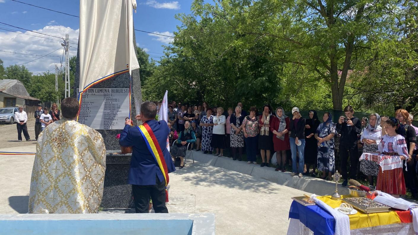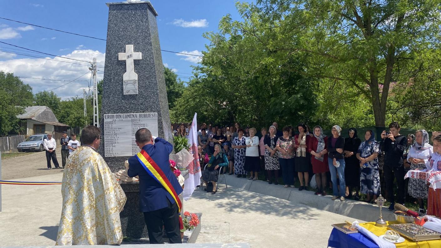 Având binecuvântarea Înaltpreasfințitului Părinte Arhiepiscop Ioachim, la invitația părintelui paroh Gabriel Albu, în prezența părintelui protopop Vasile Abageru și a preoților invitați din comună, a fost oficiată slujba sfințirii impunătorului monument închinat eroilor neamului și slujba parastasului pentru cei adormiți, în cadrul căreia au fost pomeniți ostași, luptătorii și veteranii de război din satele comunei Huruiești.