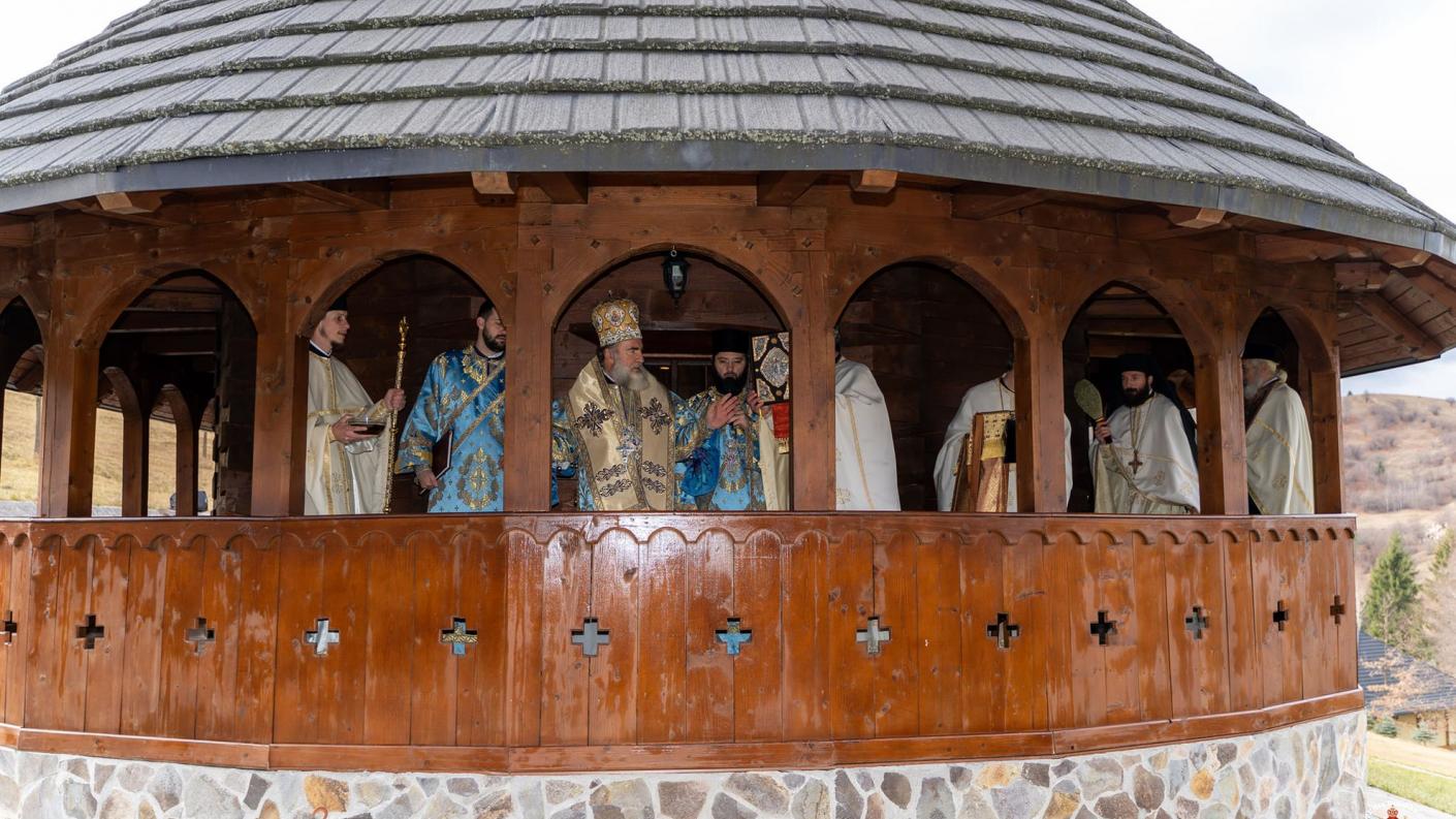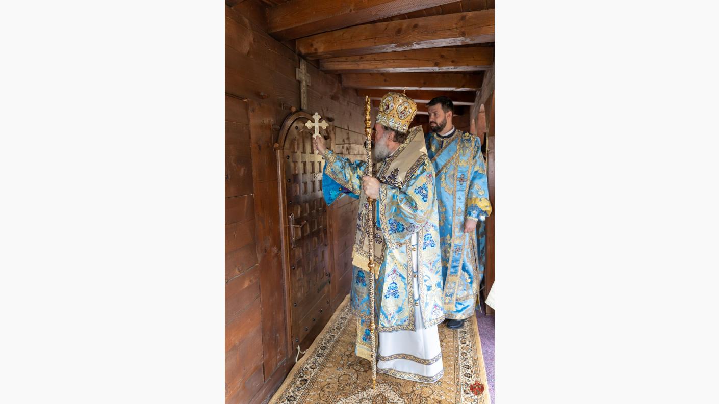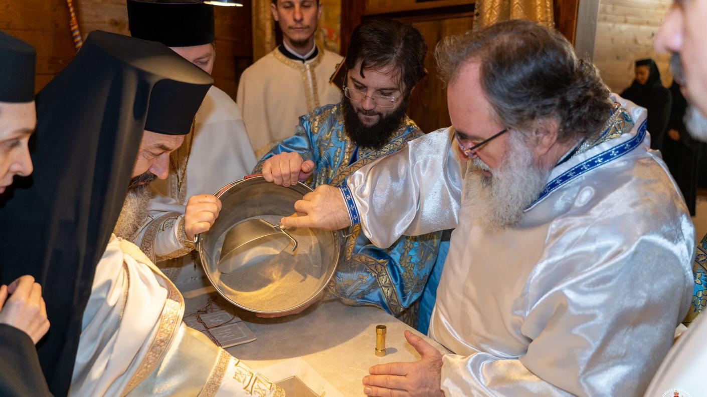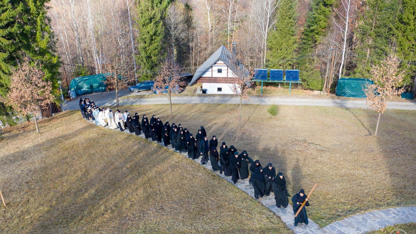 După oficierea Sfintei Liturghii în Biserică cu hramul Adormirii Maicii Domnului, soborul de preoți slujitori, însoțiți întreaga obște, s-a deplasat în procesiune până la biserica cea noua, ridicată între anii 2013-2016. Aici, Înaltpreasfințitul Părinte Arhiepiscop Ioachim a oficiat slujba de sfințire, la finalul căreia a hirotesit ca stavroforă pe Maica Stareță Evloghia Chirvase și ca iconom stavrofor pe părintele Alexie Andrei Huiban, pe seama parohiei Coşnea, Protopopiatul Moinești.