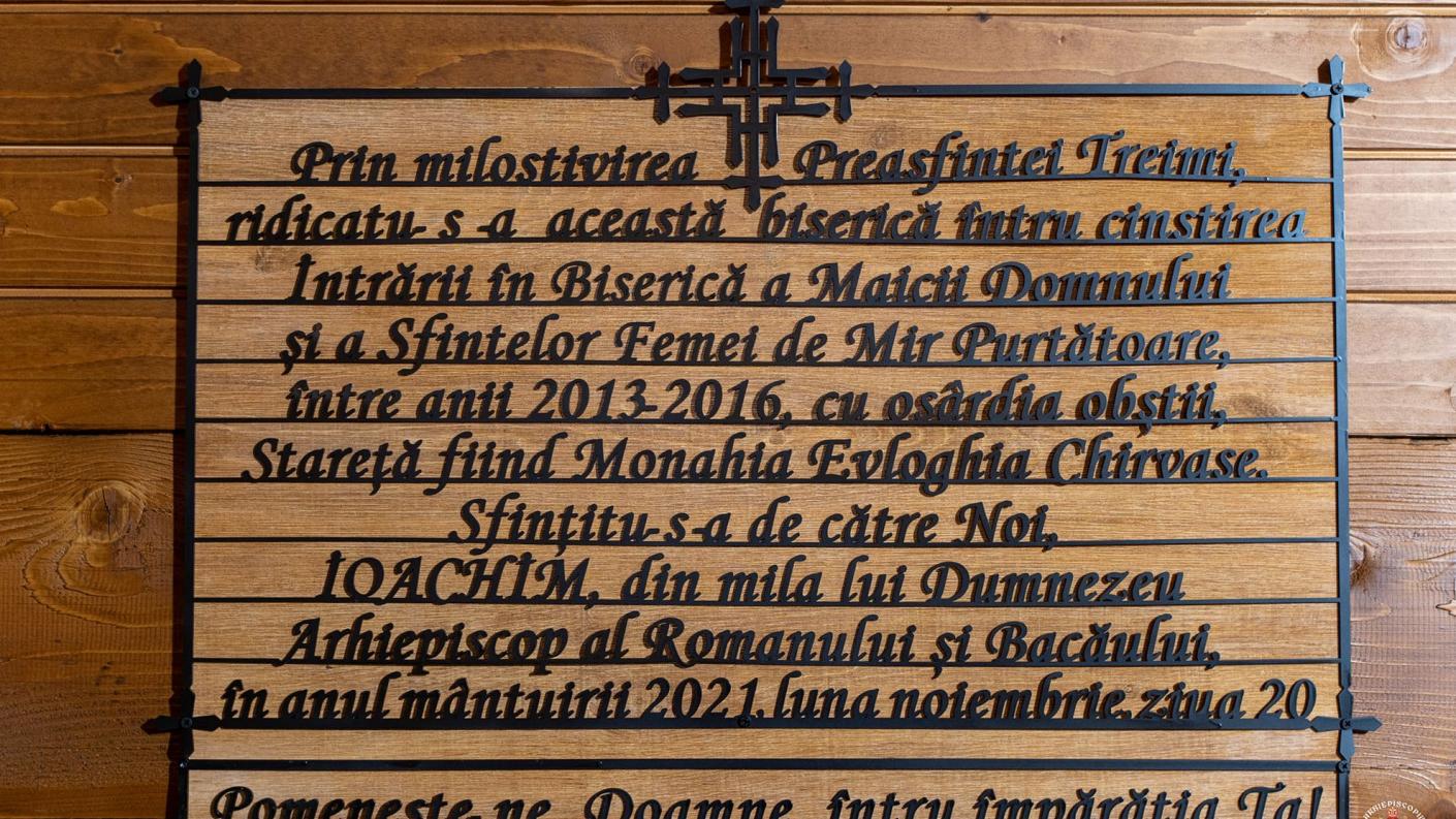 „Am sfințit o corabie, am pecetluit-o ca să fie permanent o corabie către limanurile mântuirii. Biserica târnosită astăzi se află în centrul ansamblului monastic din poiana Mănăstirii, care mai cuprinde 24 de chilii, o sală de sinaxe și biblioteca. Ea este construită în stilul arhitectonic al vechilor biserici de lemn din Moldova, cu forma de navă, fără abside, fără turlă, cu un acoperiș simplu, amintind de mântuitoarea arcă a lui Noe.