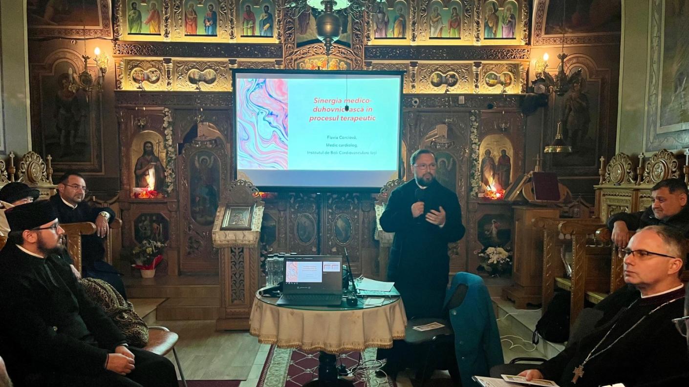 Doamna doctor Flavia Cătălina Corciovă a susținut prezentarea cu tema „Sinergia medico-duhovnicească în actul terapeutic”. Plecând de la premisa că societatea modernă în care trăim are adesea tendința de a crea false dihotomii sau divergențe între lumea așa-numit rațională sau științifică și comunitatea religioasă, domnia sa a accentuat rolul credinței în promovarea vieții sănătoase și a identificat originea spirituală a bolilor, așa cum apare ilustrată în literatura patristică, dar și în cea medicală. De asemenea, a amintit auditoriului puterea tămăduitoare a postului și a rugăciunii, aducând numeroase exemple din practica și studiile medicale, dar și legătura dintre anxietate și depresie și bolile cardiovasculare. Vindecarea este întotdeauna un proces interior, propriu fiecărui organism. Toate procedurile medicale sunt doar adjuvante, stimulatoare sau acceleratoare ale acestui proces. Procesele reparatorii sunt scrise în codul nostru genetic, iar boala apare când acestea sunt depășite sau deteriorate. Niciun antibiotic, oricât de puternic, nu va vindeca un organism incapabil de reacție, și nicio intervenție chirurgicală, chiar exemplar executată, nu va ajuta dacă mecanismele proprii de apărare sunt nefuncționale. Vindecarea presupune credința în vindecare, o conștientizare, o mărturisire și o abandonare a păcatelor, dar și o manifestare a recunoștinței pentru vindecare. În acest proces, medicii devin ,,vehicul al energiilor dumnezeiești”, cu conștiința smerită a darului lui Dumnezeu lucrător întru dânșii. Triada pacient – medic – preot trebuie să rămână mereu subscrisă cuvintelor Mântuitorului: „Unde sunt doi sau trei adunați în numele meu, acolo voi fi și Eu” (Matei 18, 20).