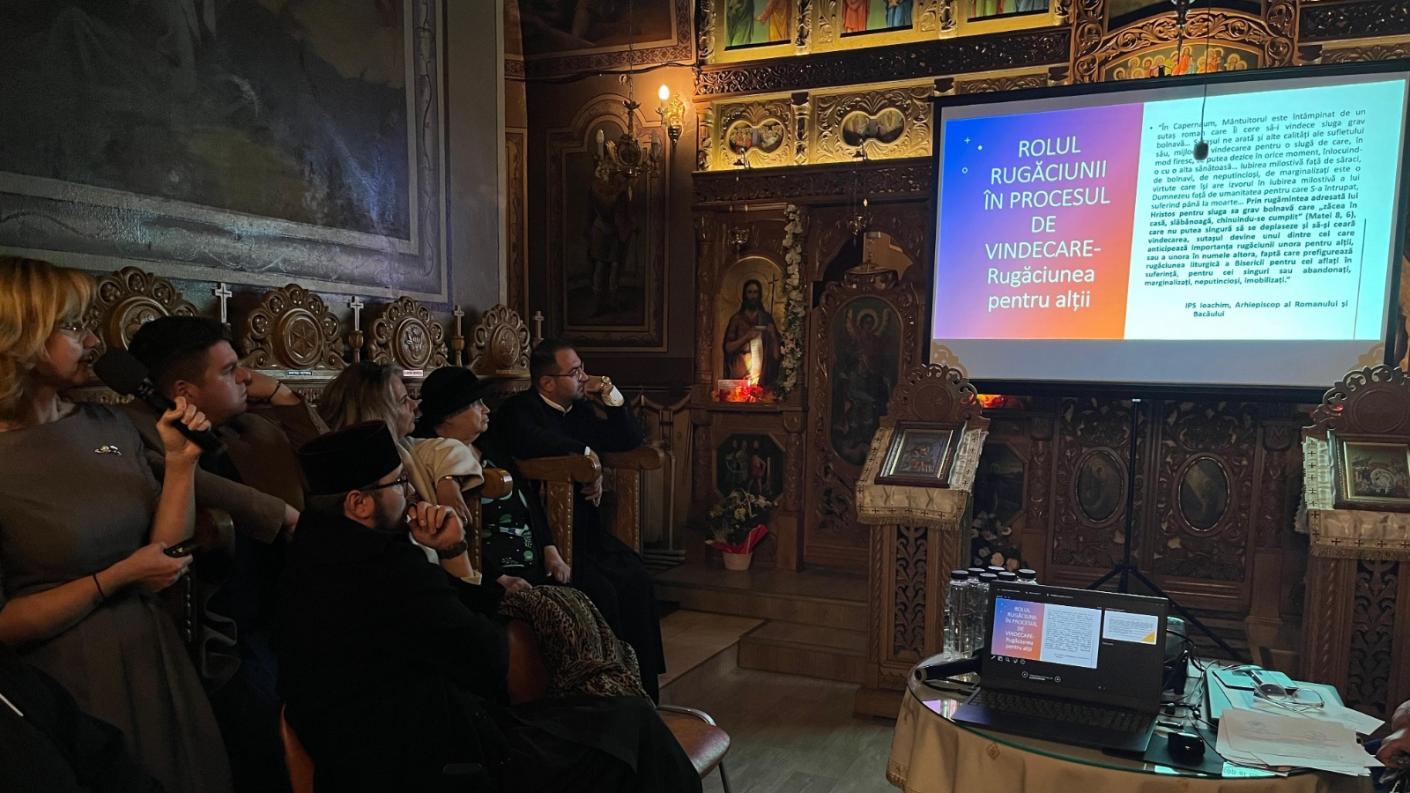Programul simpozionului, moderat de către doamna prof. Teodora Plăeșu, președinta Asociației, a debutat cu rugăciunea pentru cei bolnavi, alcătuită de Înaltpreasfințitul Părinte Ioachim, rostită de către părintele consilier Ilarion Mâță, care a transmis și mesajul de binecuvântare al Ierarhului. În continuare, plecând de la cuvintele părintelui Patriarh Daniel că „viața și sănătatea sunt darurile cele mai de preț ale omului contemporan”, preacucernicia sa a realizat un istoric al asistenței sociale, începând de la textele scripturistice și mergând până în contemporaneitate: „Hristos Domnul este medicul și medicamentul: medic în Biserică pentru cei care caută sănătatea trupească și sufletească și medicament în Sfânta Euharistie. Putem vorbi despre Biserica din Spital și despre Spitalul din Biserică, fiindcă grija față de bolnavi este o responsabilitate socială și morală. Scopul vindecării este mântuirea și îndumnezeirea omului. Și medicul și preotul caută să dăruiască sănătate, dar scopul final rămâne îndumnezeirea omului. Există o permanentă grijă față de bolnavi în scrierile Sfinților Părinți, mergând din veacul apostolic și până la Sfântul Grigorie Palama. De asemenea, în Țările Române au existat mereu bolnițe pe lângă mănăstiri ca Dragomirna, Dealu, Neamț, Precista Mare din Roman sau biserica Sfântul Spiridon din Iași. În actul medical, dar și în cel duhovnicesc, a existat și trebuie să existe o abordare holistică a persoanei și nu o reducere a ei doar la dimensiunea sa patologică. De aceea există o colaborare strânsă între preot, medic și ceilalți specialiști în tratarea celor bolnavi”.