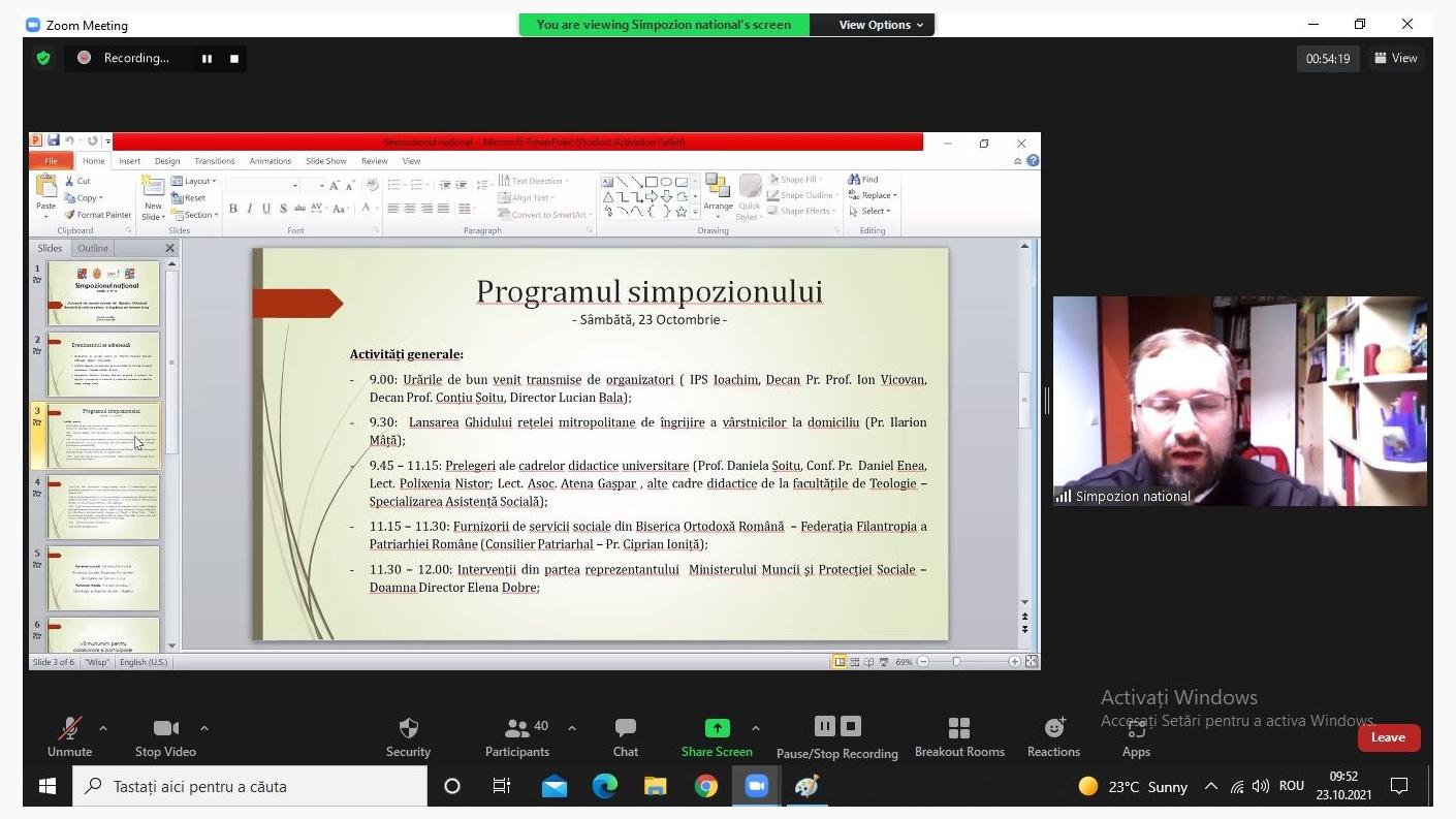 În ziua de 23 octombrie 2021, în intervalul orar 9:00-14:00 a avut loc, în format online, a VI-a ediție a Simpozionului Național „Furnizorii de servicii sociale din Biserica Ortodoxă Română și rolul acestora în îngrijirea pe termen lung”, la care au participat furnizori de servicii sociale din Patriarhia Română, instituții de învățământ superior, specializarea Asistență socială, parteneri sociali ai instituțiilor sociale din BOR și studenți teologi asistenți sociali.