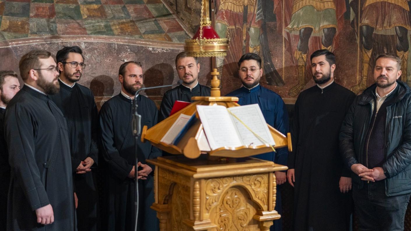 Răspunsurile la strană au fost date de Corul psaltic Diaconia al Catedralei Arhiepiscopale din Roman.