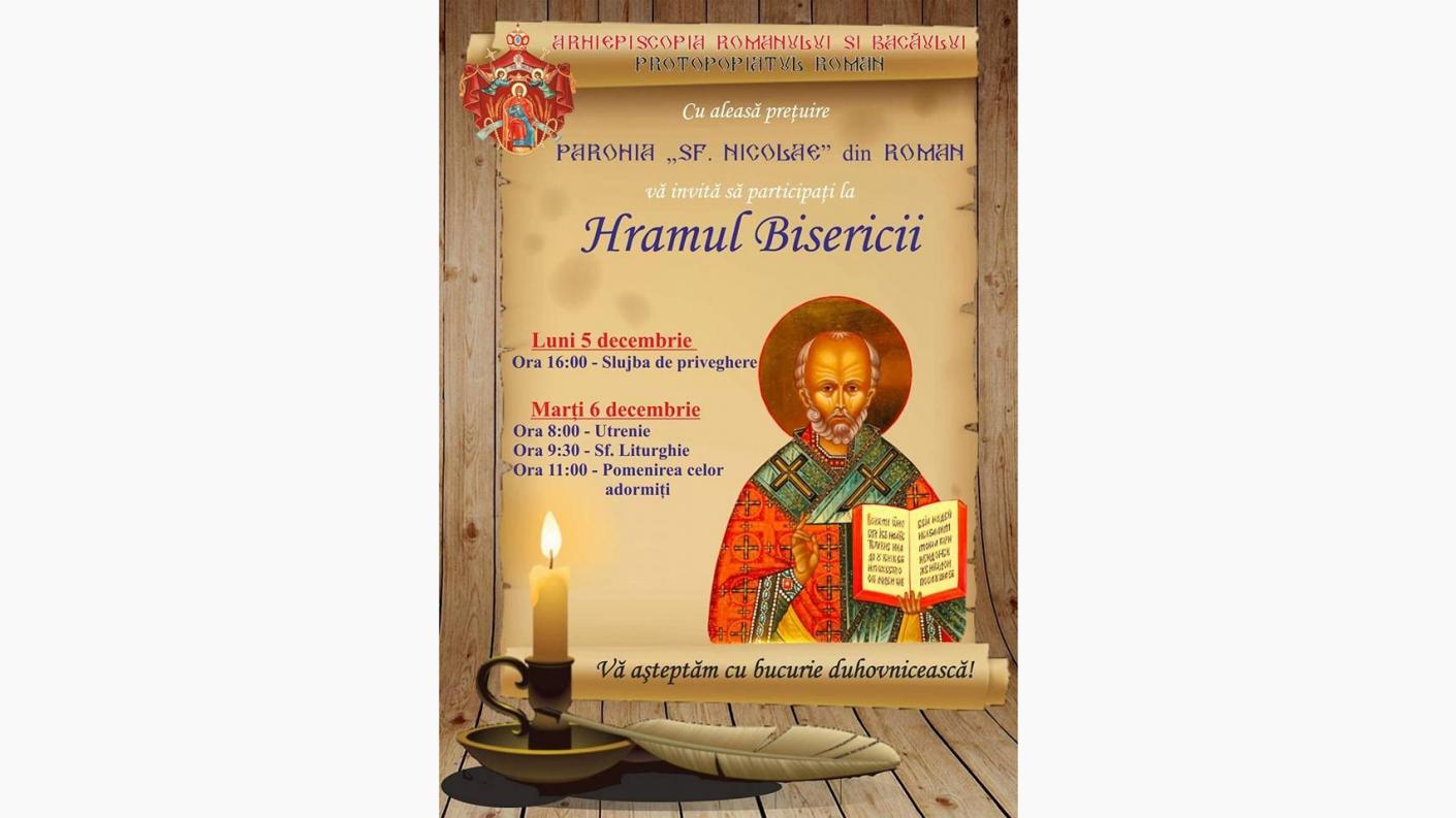 Luni, 5 decembrie a.c. , începând cu ora 16.00, la biserica “Sf. Nicolae” din municipiul Roman, Protopopiatul Roman, în ajun de cinstire a Sfântului Ierarh Nicolae, cu binecuvântarea IPS Părinte Ioachim, Arhiepiscopul Romanului și Bacăului, a avut loc o slujbă de priveghere.