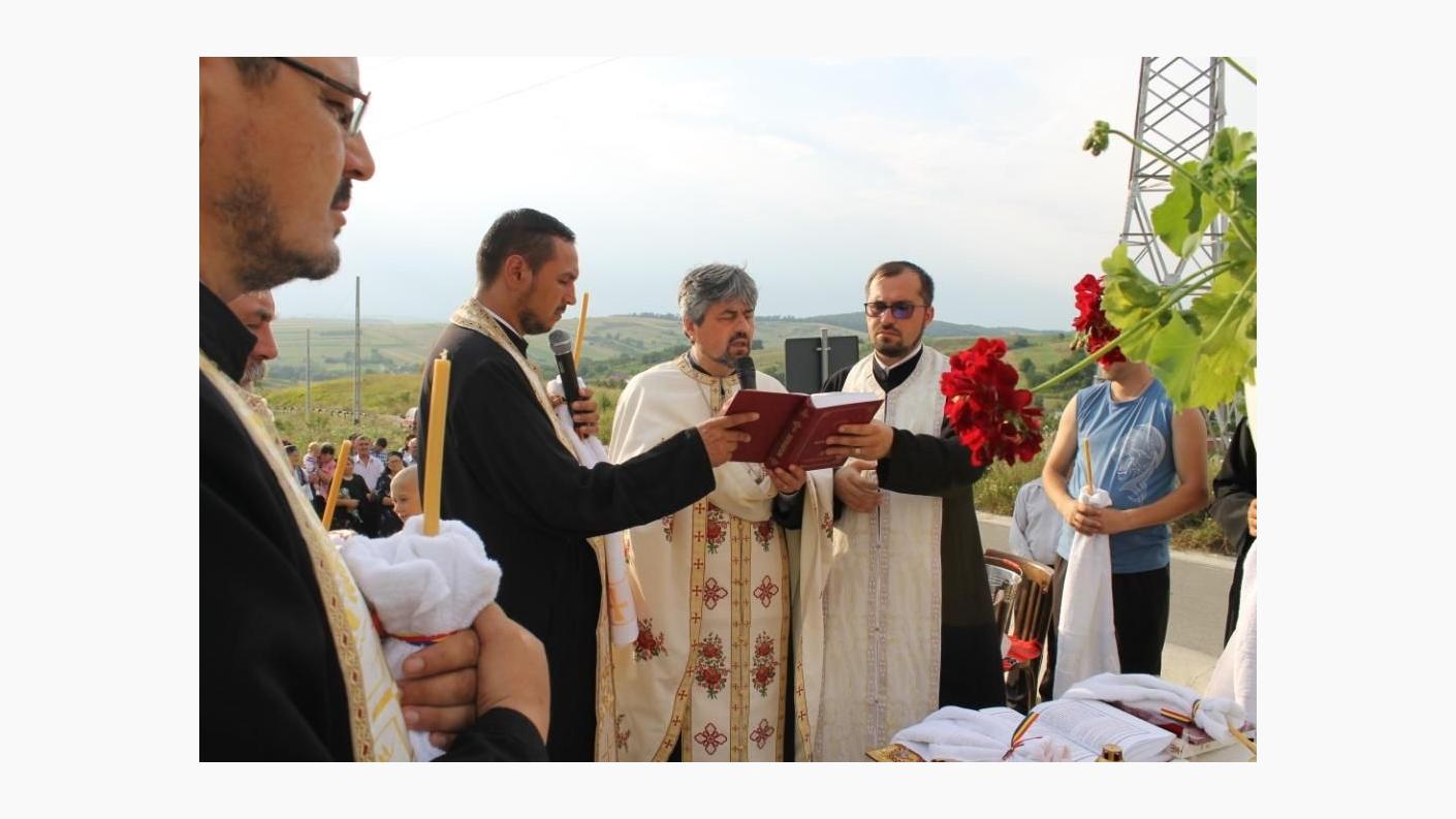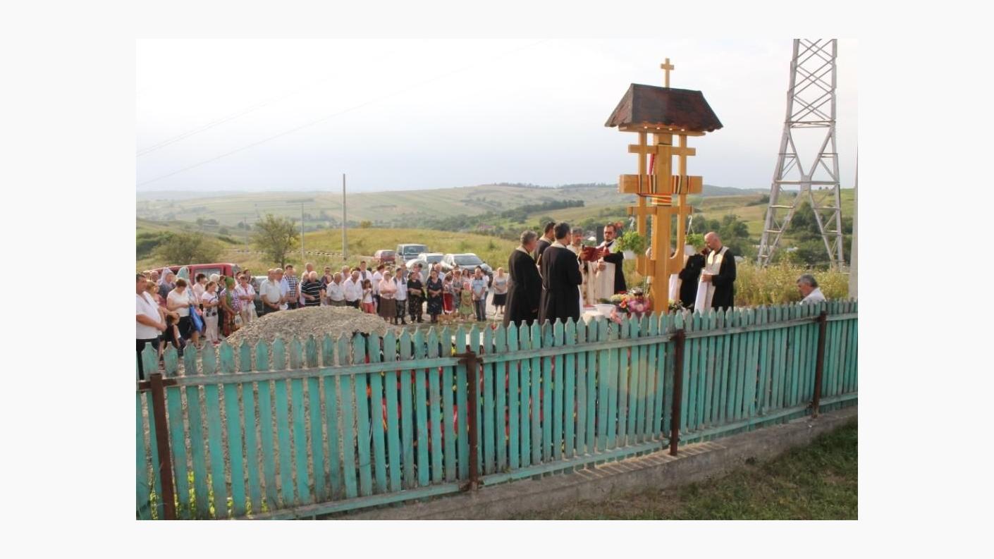 Apoi, începând cu ora 18.00, sub protia preacucernicului părinte protoiereu Costel Mareş, alături de un sobor de preoţi, credincioşii s-au deplasat în faţa curţii parohiale, acolo unde a fost pregătit postamentul din beton şi noua troiţă din lemn, pentru sfiţire.