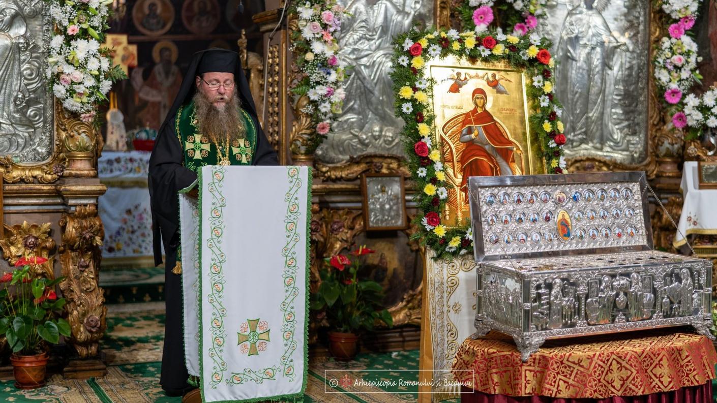 Cler și popor s-au adunat în rugăciune la racla ce adăpostește o părticică din sfintele moaște ale Sfintei Parascheva, aflată în Catedrala arhiepiscopală din Roman, cu prilejul Vecerniei hramului acestui sfânt chivot mușatin închinat ocrotitoarei întregii Moldove. Cu binecuvântarea și în prezența Înaltpreasfințitului Părinte Ioachim, soborul slujitorilor a oficiat slujba Vecerniei sub protia Preasfințitului Părinte Andrei, Episcopul Covesnei și Harghitei.