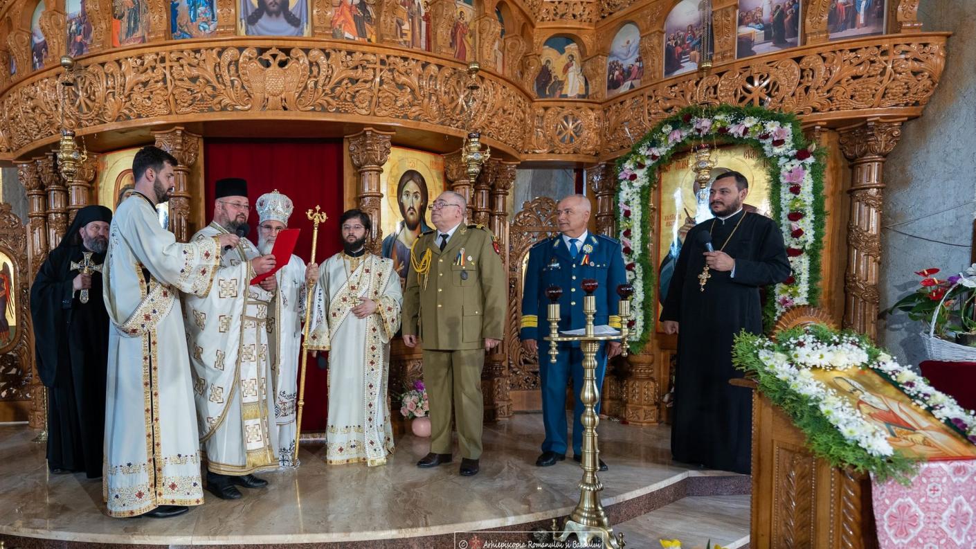 Apoi, dl general în rezervă de flotilă aeriană, Florea Vasile, președintele Filialei Bacău a Asociației Veteranilor de Război, a înmânat Înaltpreasfințitului Părinte Ioachim o distincție prilejuită de zilele asociației, „în semn de prețuire și considerație pentru sprijinirea activităților dedicate luptătorilor care au plecat în viața eternă”, adresând asistenței un cuvânt în care a vorbit despre cei doi stâlpi ai românității și sensul jertfei ostașului român: „Întotdeauna acest neam s-a bazat pe doi stâlpi, pe Biserică și pe Armată. Veteranii de război, pe care eu îi reprezint, întotdeauna s-au așezat pe câmpul de luptă între viață și moarte, iar între viață și moarte ei au ales jertfa, pentru a avea viață veșnică”.
