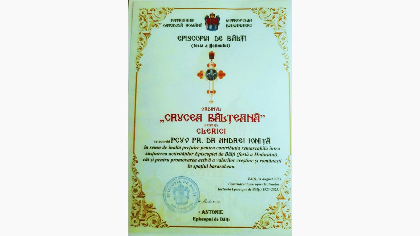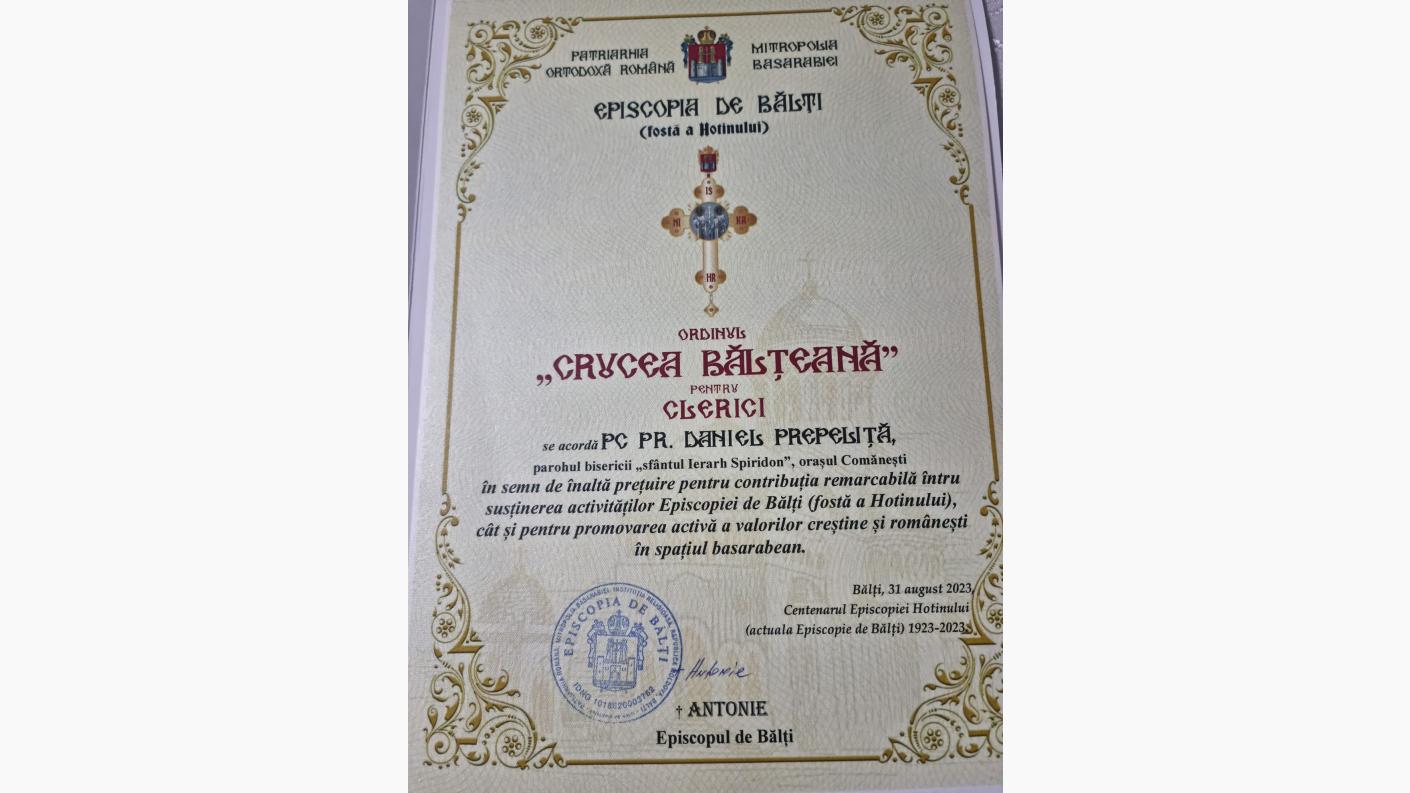 Preasfințitul Episcop Antonie a oferit cu acest prilej „Crucea Bălţeană”, cea mai înaltă distincție a Episcopiei de Bălți, pentru 12 clerici şi mireni care au susţinut în ultimii ani Episcopia de Bălţi. Între aceștia s-au aflat și doi reprezentanți ai Arhiepiscopiei Romanului și Bacăului - părintele arhimandrit Andrei Ioniță, de la Catedrala Arhiepiscopală din Roman, și părintele Daniel Prepeliță, parohul bisericii "Sf. Ierarh Spiridon" din Comănești.