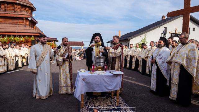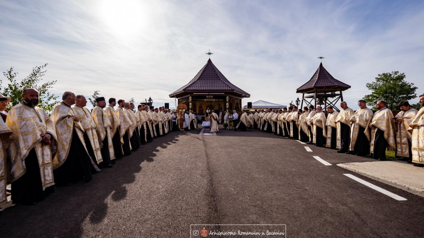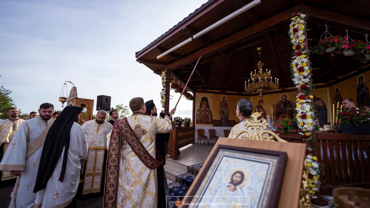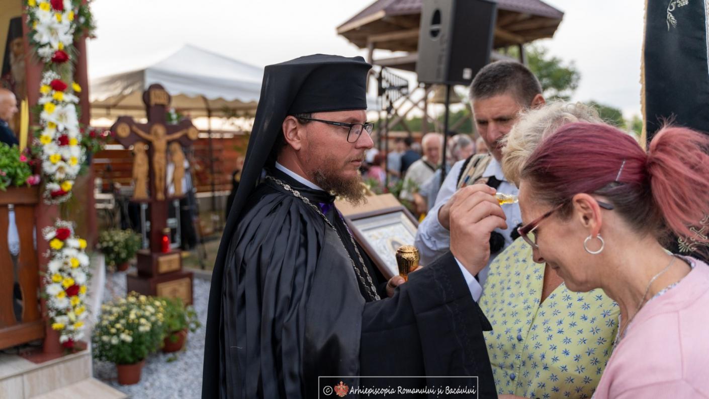 Odată ajunși la schit, credincioșii au participat la slujba de sfințire a noului altar de vară, care a fost pus sub ocrotirea Sfinților Cuvioși Paisie și Cleopa de la Mănăstirea Sihăstria. Slujba a fost săvârșită de Preasfințitul Părinte Teofil Trotușanul, Episcop-vicar al Arhiepiscopiei Romanului și Bacăului, cu binecuvântarea Înaltpreasfințitului Părinte Ioachim. În încheiere, Preasfințitul Părinte Teofil a ținut un cuvânt de învățătură în care a vorbit despre importanța Sfintei Cruci în viața creștinilor: