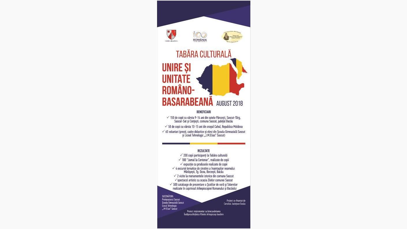 Fundația „Episcop Melchisedec” – Filila Bacău în calitate de Beneficiar și Consiliul Județean Bacău în calitate de Autoritate contractantă au implementat în perioada august – noiembrie 2018 proiectul „TABĂRA CULTURALĂ: UNIRE ȘI UNITATE ROMÂNO-BASARABEANĂ”, finanțat conform Legii nr. 350 din 2 decembrie 2005, cu modificările şi completările ulterioare.