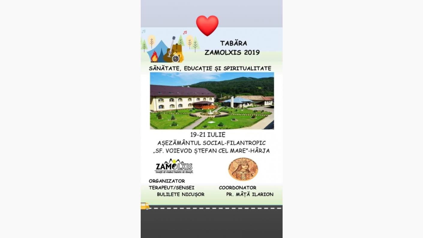 Clubul sportiv de arte marțiale și terapie prin mișcare Zamolxis Onești în parteneriat cu Așezământul Social-Filantropic "Sf. Voievod Ștefan Cel Mare-Hârja" a organizat tabăra pentru copii și tineri, în data de 19-21iulie, la Hârja, promovând cele trei tematici ale vieții: sănătate, educație și spiritualitate.