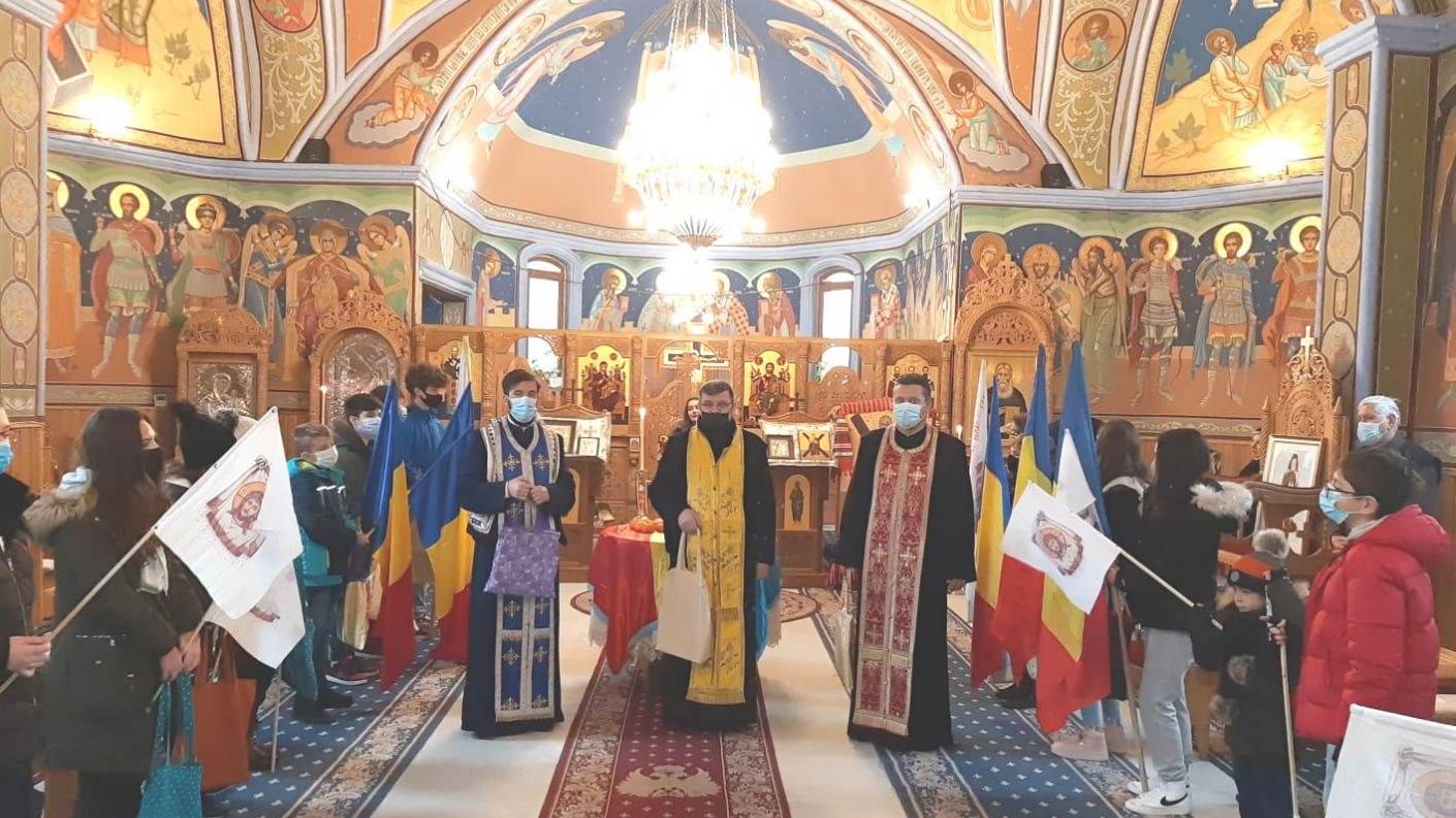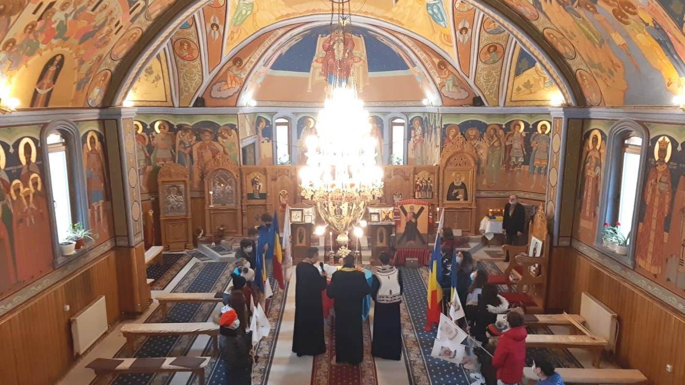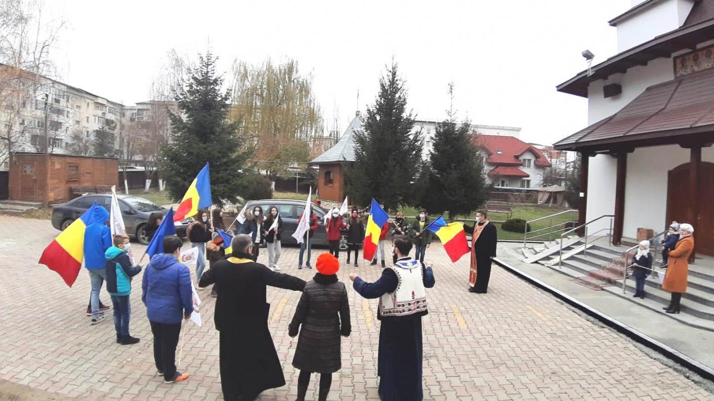 Această atmosferă de sărbătoare a fost întregită de prezenţa unor tineri inimoşi, elevi ai Şcolii Gimnaziale „Mihai Drăgan” din Bacău, coordonaţi de către doamna prof. de religie Cîrlan Mirela-Nela, înfrumuseţând slujba cu rugăciunile lor. Ei au purtat steaguri tricolore şi au intonat cântece patriotice.