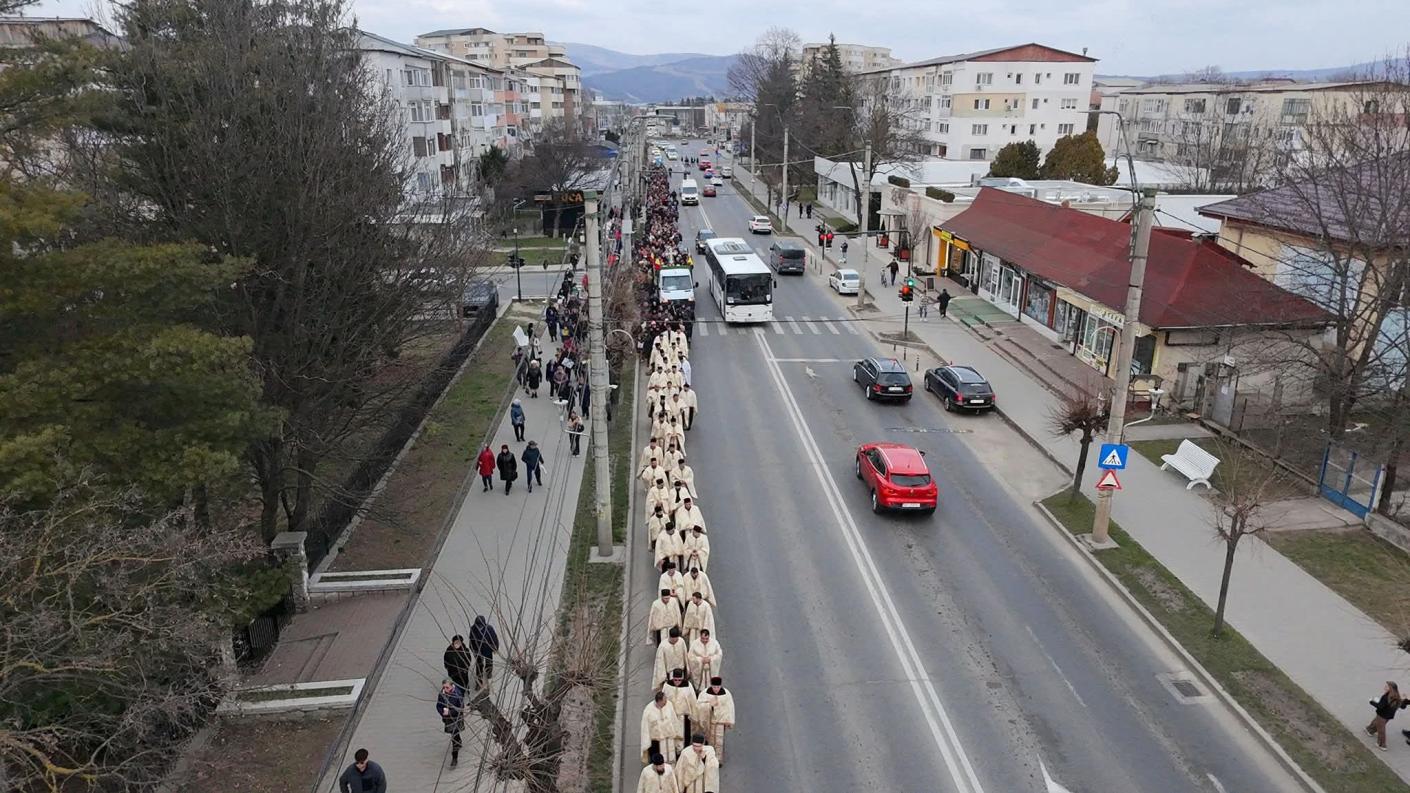 Având binecuvântarea Înaltpreasfințitului Părinte Ioachim, Arhiepiscopul Romanului și Bacăului, și prin implicarea directă a părintelui protopop Nicolae Zaharia, evenimentul a debutat la Biserica „Sfinții Împărați Constantin și Elena”, din municipiu. Într-o atmosferă de profundă evlavie, coloana de credincioși, organizată atent de reprezentanții Poliției și ai Jandarmeriei, s-a deplasat pe Bulevardul Republicii către Catedrala „Pogorârea Sfântului Duh”.