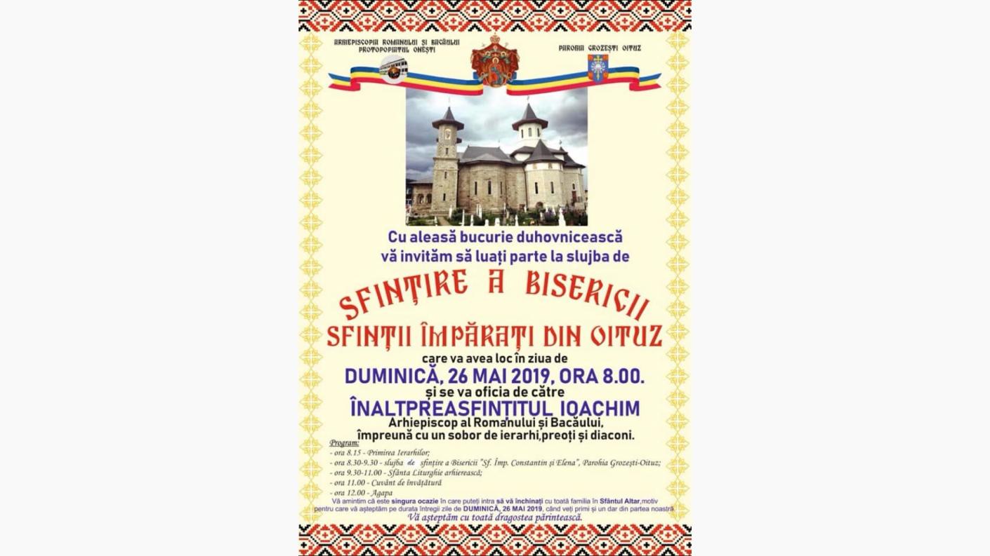 Biserica Parohiei Grozești din Oituz, județul Bacău, numită și Mausoleu Duhovnicesc al Eroilor Reîntregirii Neamului Românesc, a fost resfințită duminică 26 mai 2019. În cimitirul eroilor din preajma bisericii sunt înhumați 18.600 soldați care au murit în luptele de la Oituz din Primul Război Mondial. În cadrul slujbei a avut loc și o hirotonie întru preot. Cu prilejul sfințirii, biserica a primit ca ocrotitori și pe Sfântul Ioan Gură de Aur împreună cu mama sa Antusa.
