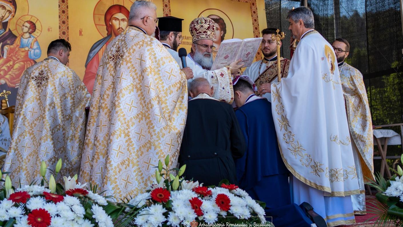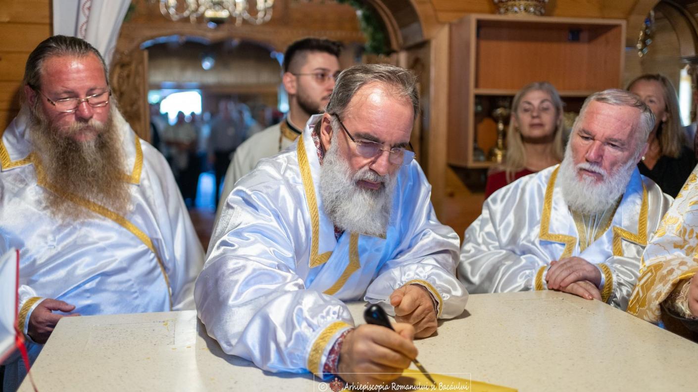Sâmbătă, 2 septembrie, la primele ore ale dimineții, PS Andrei, Episcopul Covasnei și Harghitei și PS Visarion, Episcopul Tulcii, au oficiat Dumnezeiasca Liturghie alături de un numeros sobor de preoți pe o scenă amplasată în proximitea Bisericii. În jurul orei 10.00 cei peste 2000 de credincioși, împreună cu ierarhii și preoții, l-au întâmpinat pe Înaltpreasfințitul Părinte Ioachim, Arhiepiscopul Romanului și Bacăului. Au urmat cuvântul ierarhului eparhiot, un moment dedicat tinerilor și organizat de către Protopopiatul Moinești în cadrul Zilelor cultural duhovnicești ale acestei instituții, precum și oferirea de distincții ctitorilor. În semn de apreciere a activității desfășurate de-a lungul timpului în ceea ce privește lucrările de ctitorire a sfântului lăcaș sfințit în această zi, Înaltpreasfințitul Părinte Ioachim i-a hirotesit pe preotul paroh Vasile Ropotoia și preotul slujitor Costinel Milon preotul oferindu-le rangul onorific de iconom stavrofor. Totodată, părintele paroh a primit Crucea Țării de Jos, cea mai înaltă distincție a Arhiepiscopiei Romanului și Bacăului.