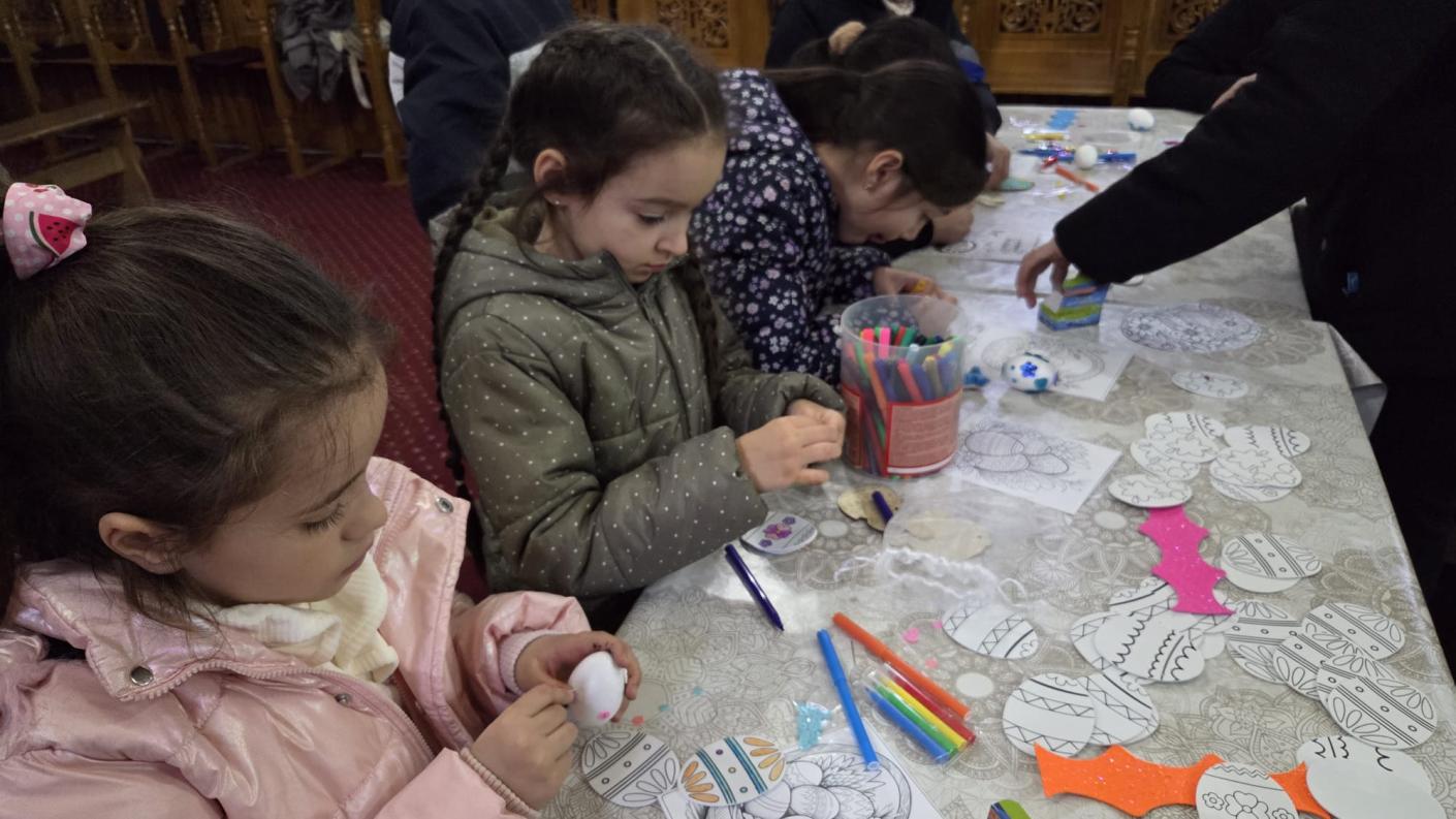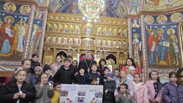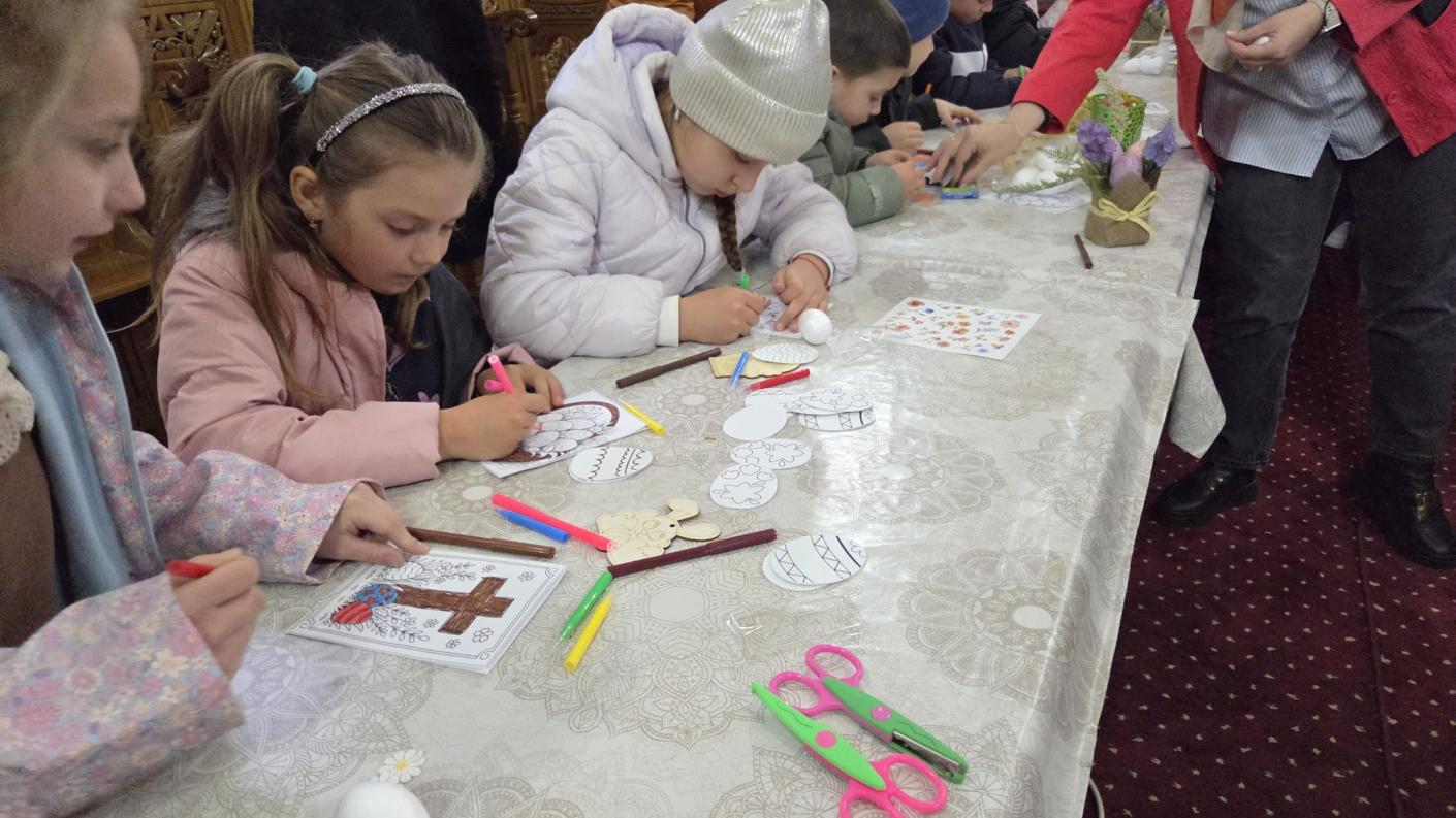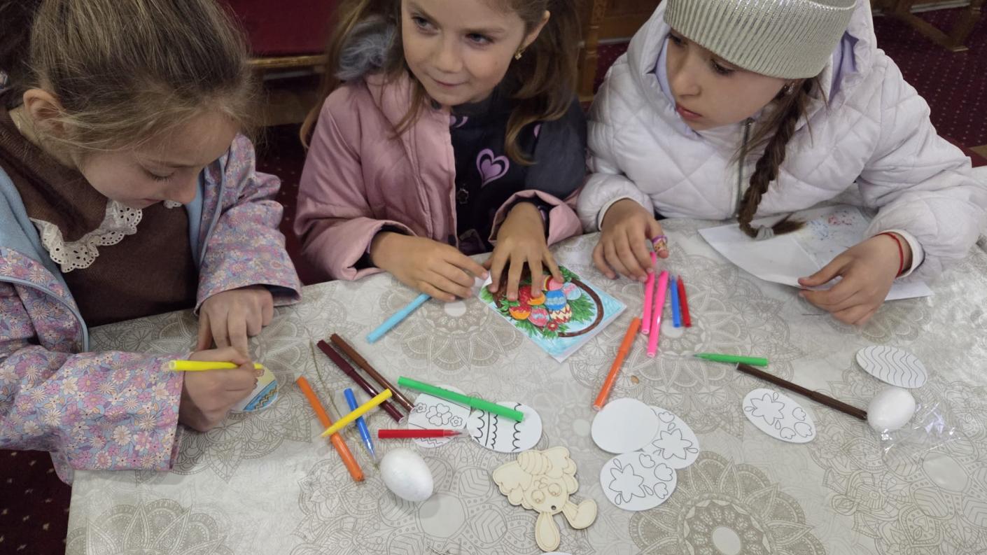 Expunerea catehetică a fost urmată de un atelier de desen, în care cei mici au creat felicitări și au încondeiat ouă cu tematică pascală, consolidând astfel prin culoare și joc ceea ce au auzit în cadrul catehezei.