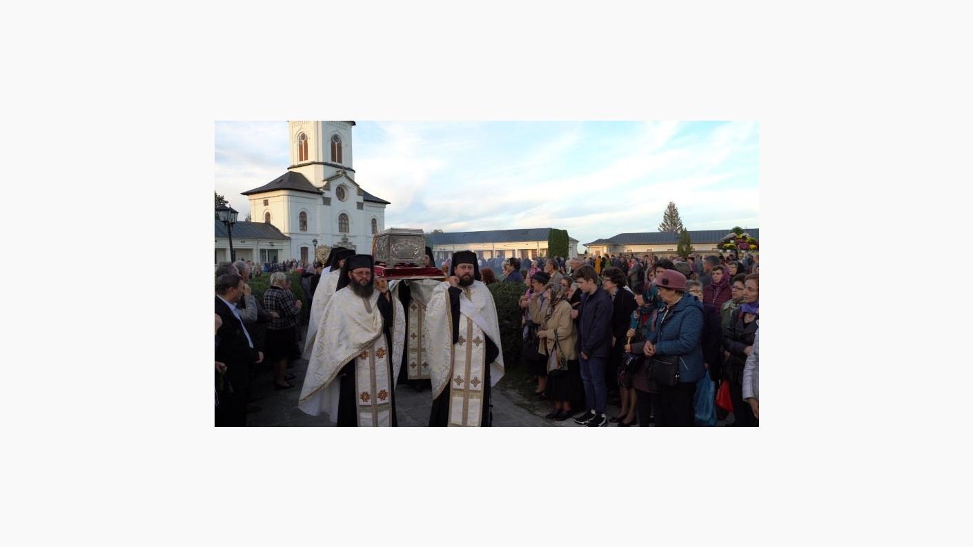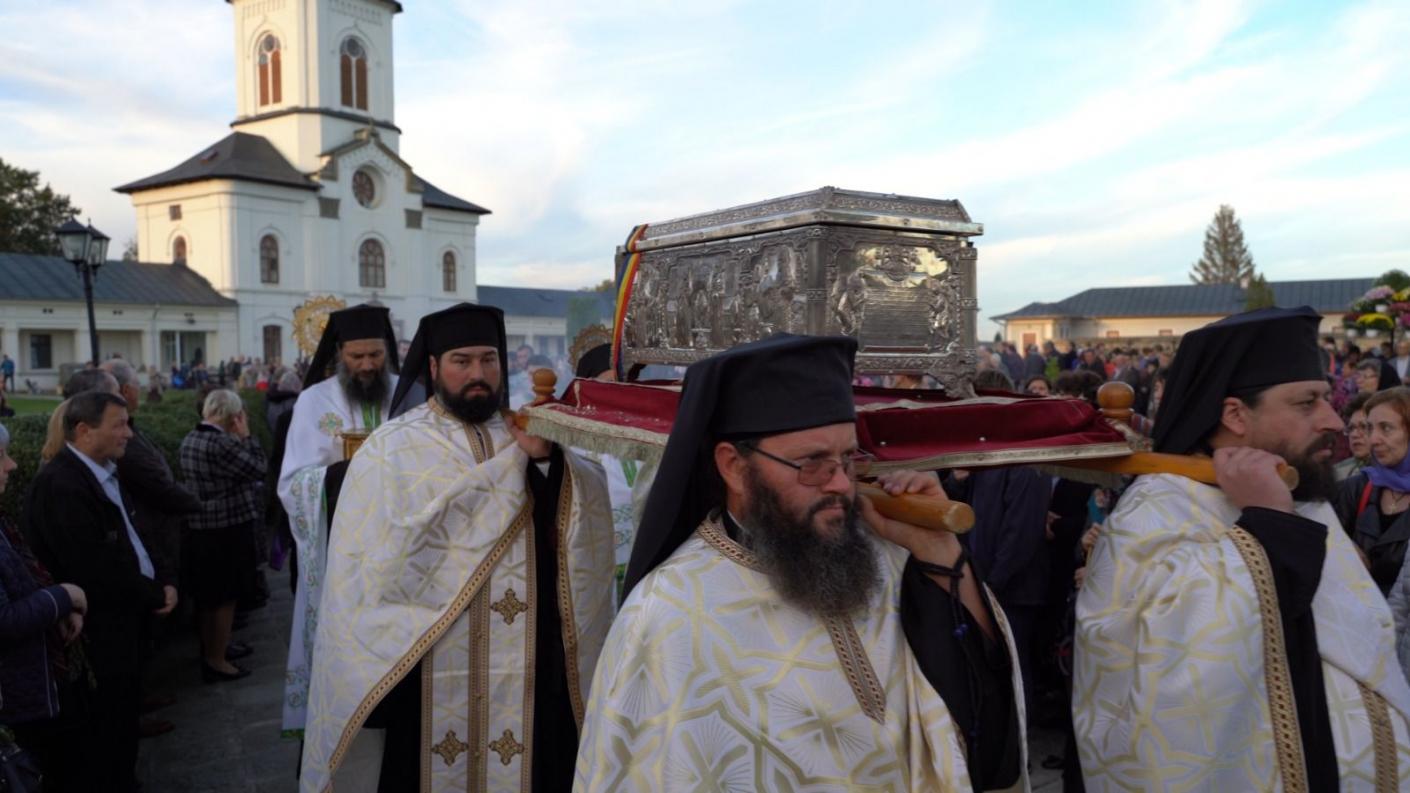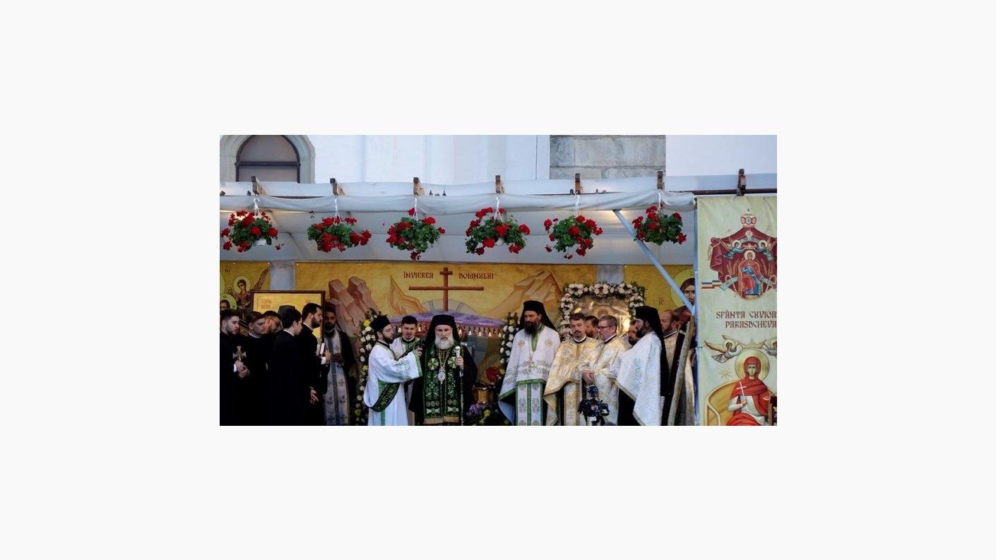 Cler și popor s-au adunat în rugăciune la racla ce adăpostește o părticică din sfintele moaște ale Sfintei Parascheva, aflată în Catedrala arhiepiscopală din Roman, cu prilejul Vecerniei hramului acestui sfânt chivot mușatin închinat ocrotitoarei întregii Moldove. După oficierea slujbei, în sunet de clopot, soborul preoților și pelerinii prezenți s-au deplasat în procesiune înălțând imnuri de cinstire Sfintei Parascheva și înconjurând Catedrala arhiepiscopală, oprindu-se în cele patru puncte cardinale pentru a mijloci în rugăciune ajutorul și ocrotirea lui Dumnezeu. La finalul procesiunii, racla cu sfinte moaște a fost așezată într-un baldachin pe scena amenajată în latura de miazănoapte a Catedralei, unde Înaltpreasfințitul Părinte Ioachim a oficiat slujba acatistului închinat sfintei care în aceste zile de sărbătoare înalță inimile românilor din întreaga țară.