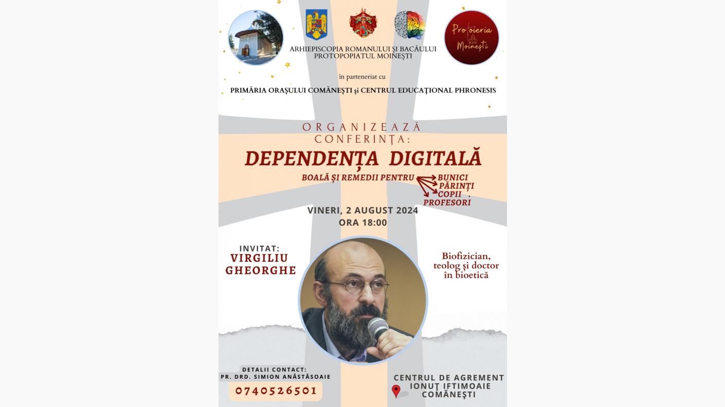 Vineri, 2 august 2024, ora 18:00, la Centrul de Agrement „Ionuț Iftimoaie” din orașul Comănești a avut loc conferința „ADICȚIA DIGITALĂ – boală și remedii pentru părinți, profesori, tineri și copii”, susținută de către biofizicianul și doctor în bioetică Virgiliu Gheorghe, vicepreşedintele Institutului de Cercetări Psihosociale şi Bioetică Bucureşti. Organizarea acestei conferințe a fost realizată de către Protoieria Moinesti în parteneriat cu Primăria orașului Comănești și Centru Educațional Phronesis cu ocazia Zilelor Orașului Comănești și în contextul Anului omagial al pastorației și îngrijirii bolnavilor.