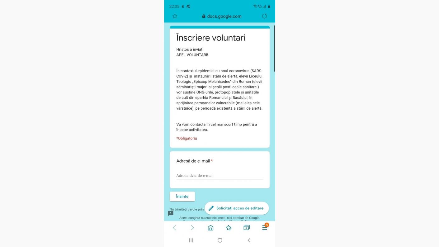 https://docs.google.com/forms/d/13bF89JL2RXRuIUhVgtErc5GtA9tJKtin03yuwcB93Y4/edit?usp=drivesdk și distribui la adresa de email voluntariarb@gmail.com, special creată pentru această perioadă a răspândirii epidemiei de coronavirus (COVID – 19);
