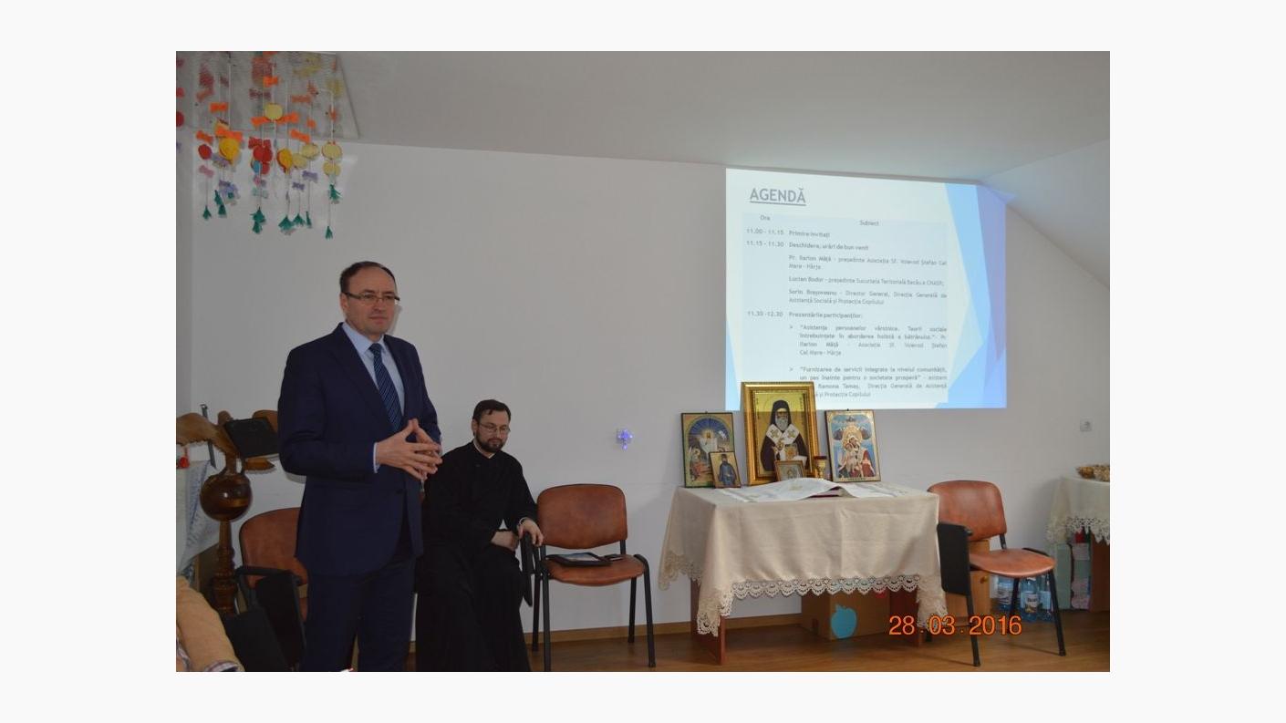 După prezentarea documentarului Trinitas TV al Asociației ”Sf. Voievod Ștefan cel Mare – Hârja” și cuvântul de bun venit al președintelui acesteia, pr. Ilarion Mâță, Domnul Lucian Bodor, președintele CNSAR Bacău, a evocat rolul și misiunea asistentului social în contextul actual, invitându-l, după această intervenție, pe Domnul Director Sorin Brașoveanu să expună un punct de vedere al instituției pe care o reprezintă. În cuvântul domniei sale, a subliniat semnificația acestor momente festive și aportul adus de asistenții sociali în schimbarea adusă de către aceștia întregii societăți.