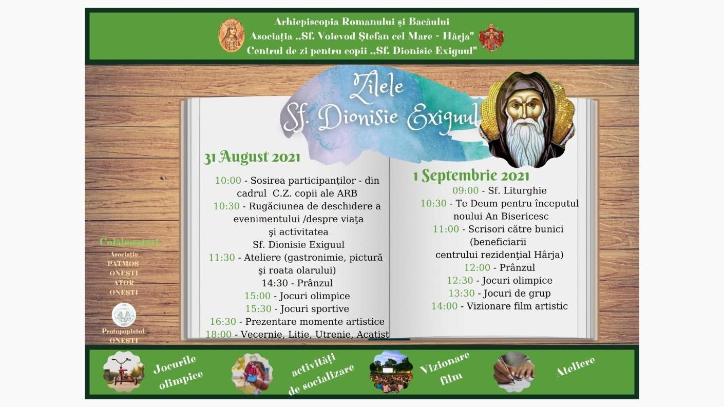Evenimentul a început marţi dimineaţă cu o rugăciune de deschidere şi o scurtă prezentare despre viaţa şi activitatea misionară a Sfântului Dionisie Exiguul. În continuare, tinerii participanţi, în număr de 70, din cadrul asociaţiilor (Sf. Voievod Ștefan cel Mare – Hârja, Sf. Anastasia Romana - Tg. Ocna și Suroti – Mănăstirea Cașin), arătându-și priceperea în ateliere ca roata olarului, gostronomic şi pictură pe sticlă. Mai apoi, micii participanţi şi-au testat energia în traseul parcurs la cursa pentru obstacole din ,,jocurile olimpice” precum şi alte jocuri sportive. Ziua s-a încheiat cu un frumos moment muzical ce a unit şi mai mult prietenia dintre voluntari şi participanţi.