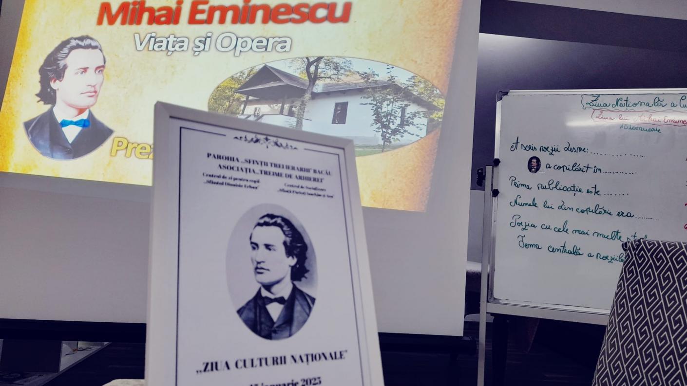 Cu binecuvântarea Înaltpreasfințitului Părinte Ioachim, Arhiepiscopul Romanului și Bacăului, în data de 15 ianuarie 2025, beneficiarii Centrului de socializare și petrecere a timpului liber pentru persoane vârstnice „Sf. Ioachim și Ana”, împreună cu copiii Centrului de zi „Sf. Dionisie Erhan” din Parohia „Sf. Trei Ierarhi” Bacău și elevi ai Școlii Gimnaziale ,,Mihai Drăgan” din Bacău, au sărbătorit Ziua Culturii Naționale, aducând un omagiu „Luceafărului poeziei românești”, Mihai Eminescu.