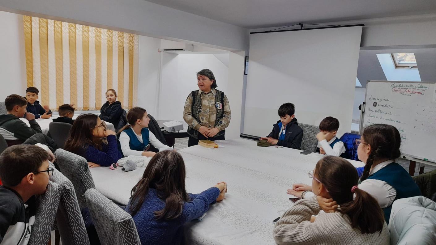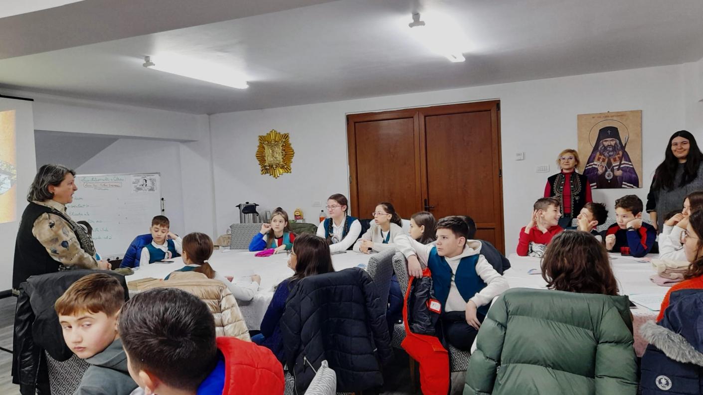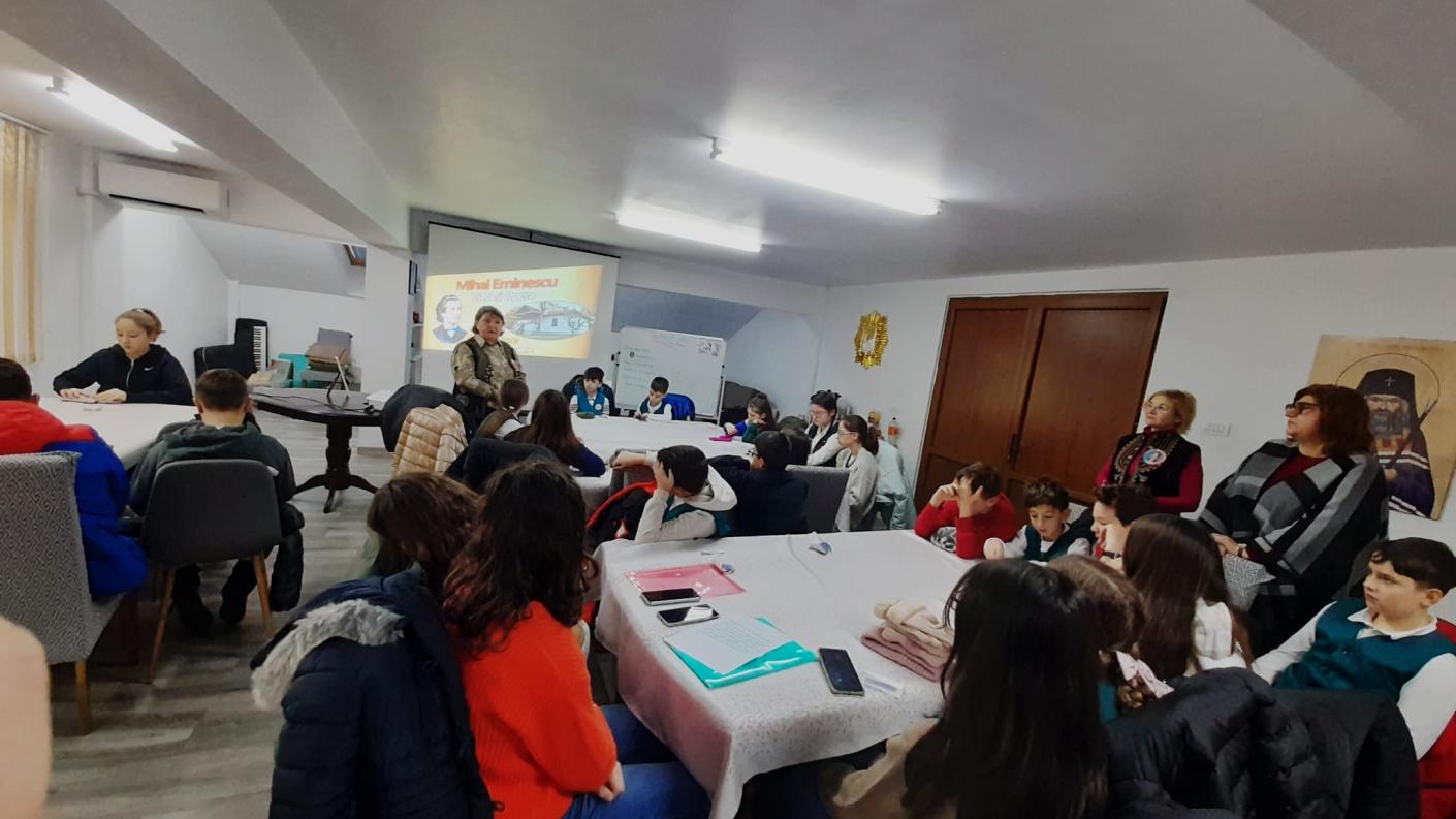 Apoi, în incinta Centrului socio-cultural parohial, doamna Adriana Blaga, bibliotecara Școlii Gimnaziale ,,Mihai Drăgan” Bacău a prezentat pentru cei prezenţi, viața și opera marelui poet, hrănind curiozitatea și dragostea de cunoaștere pentru cei mici, dar și pentru bunici.