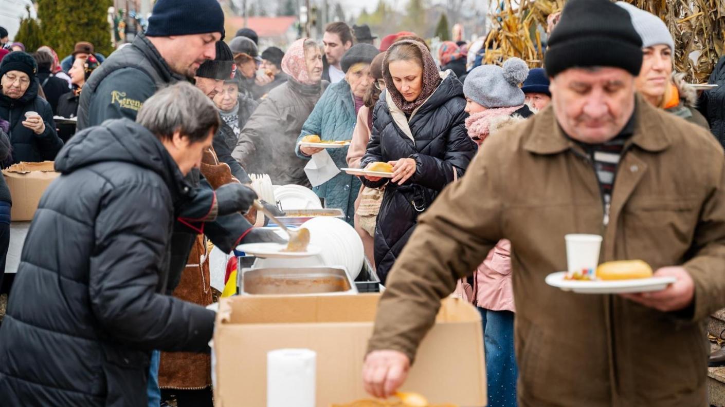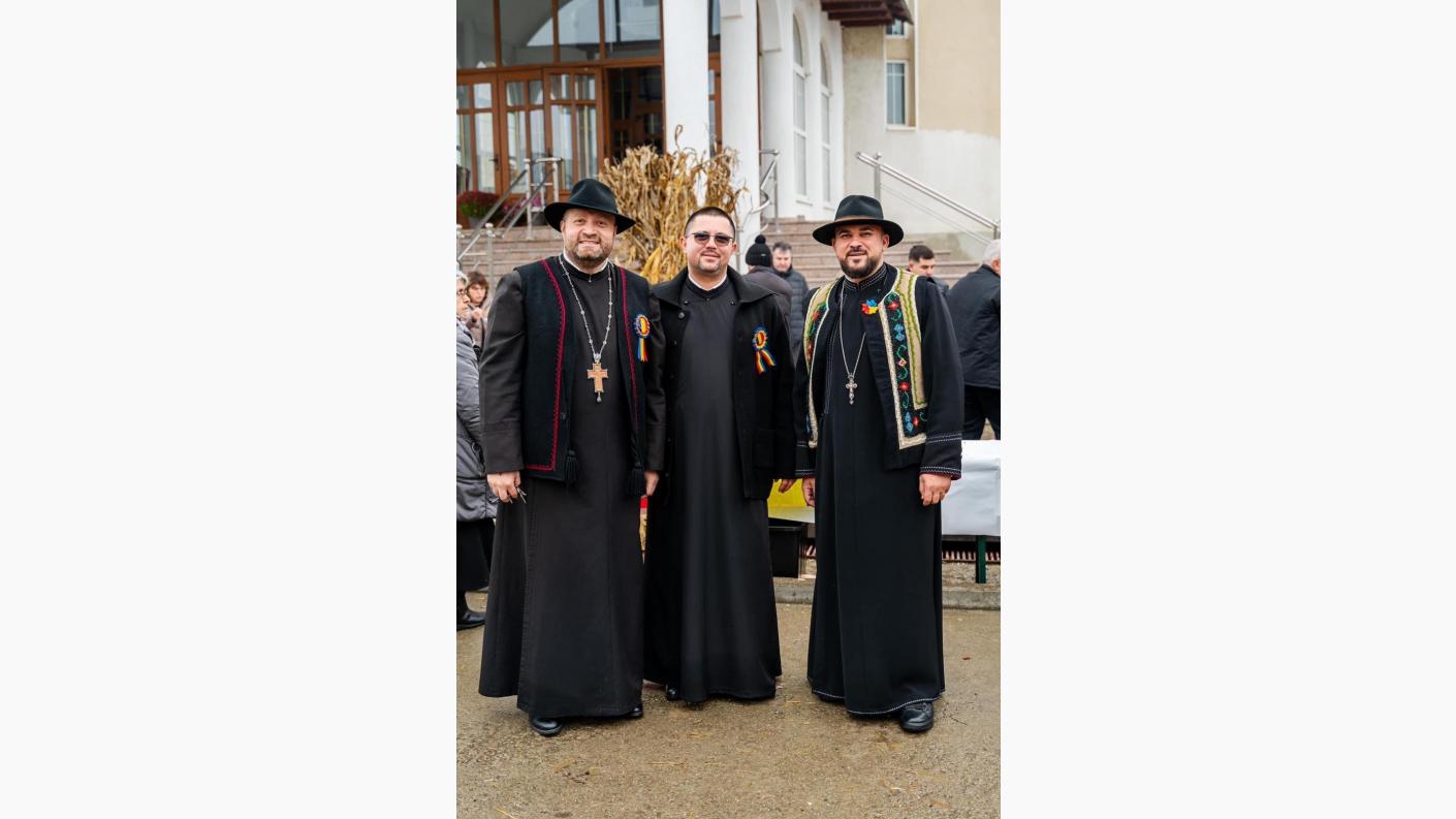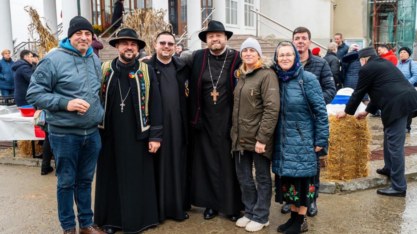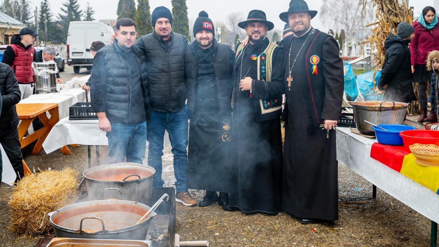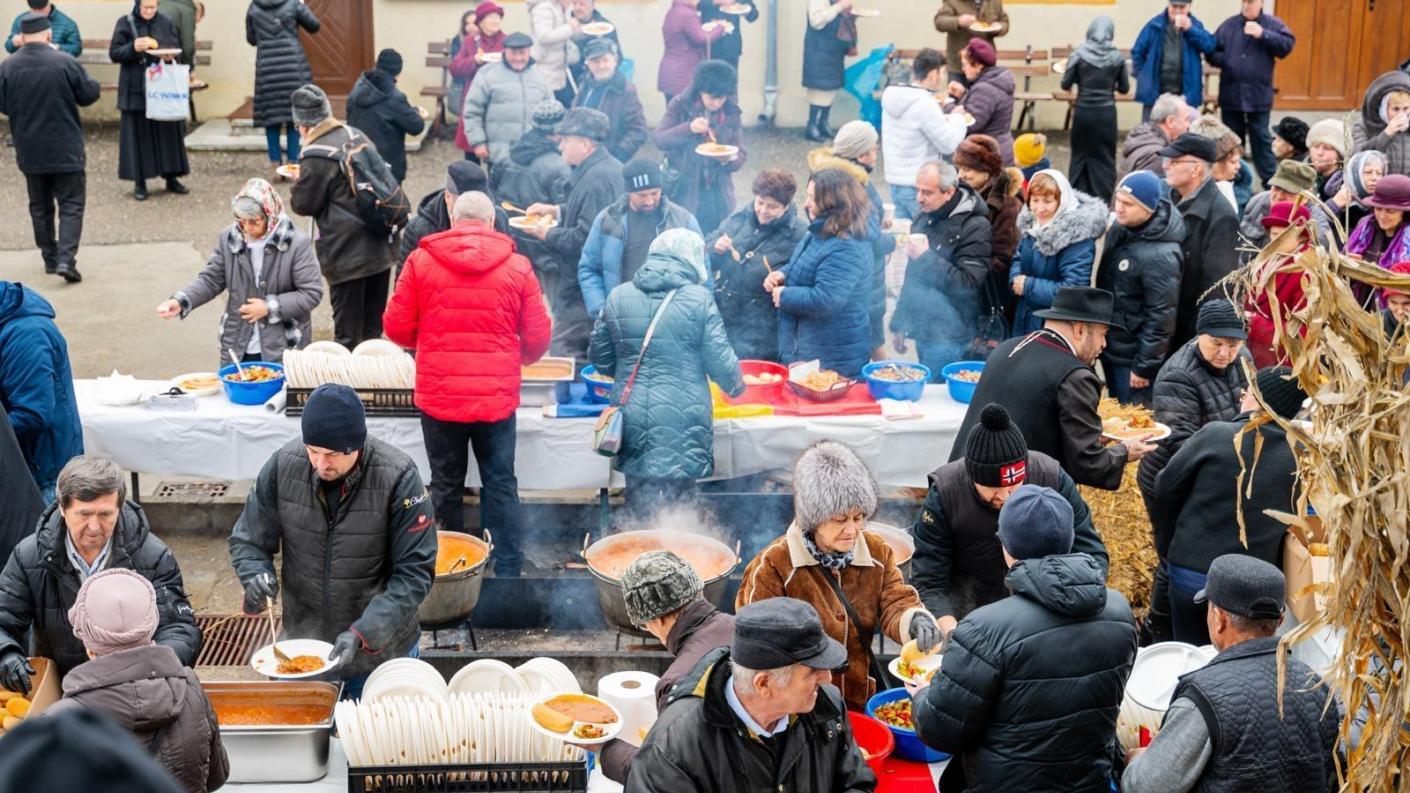 La ieșirea din sfântul lăcaș, în curtea bisericii, credincioșii au fost serviți cu fasole proaspăt pregătită, de către bucătari cu inimă mare, chef Daniel și chef Vlad, cu prăjituri preparate cu drag de către doamnele gospodine din comunitatea parohială, cu vin fiert și cafea. (pr. Ionuț Avram)